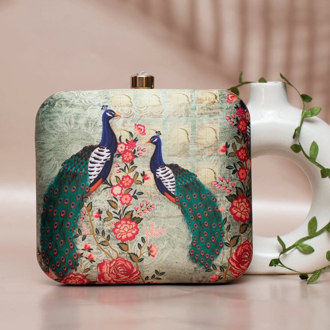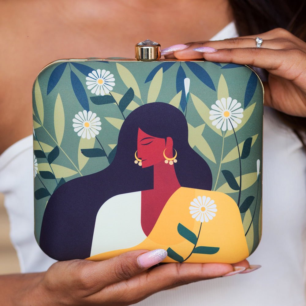 Yellow Saree Lady on Flower Green and White Leaf Background Printed Clutch