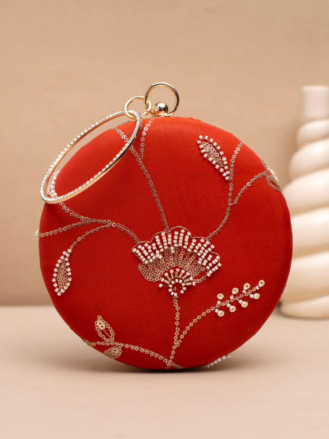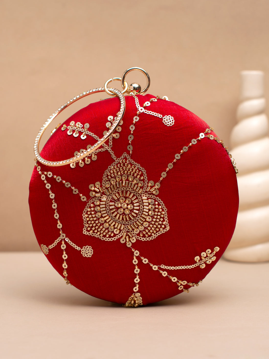 Artklim Round Scarlet Clutch with Golden Embroidery