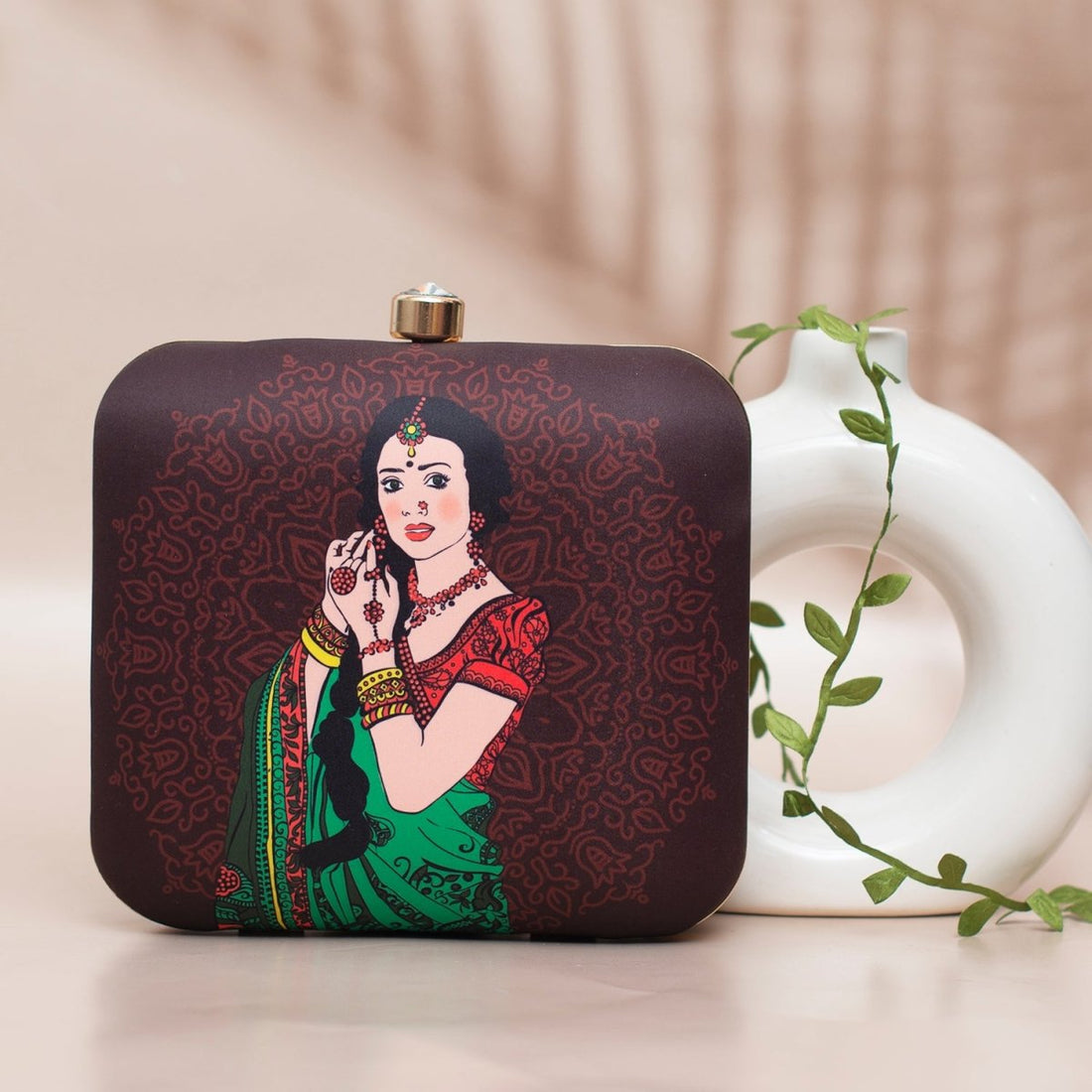 Artklim Beige Based Leaf Girl Portrait Printed Clutch