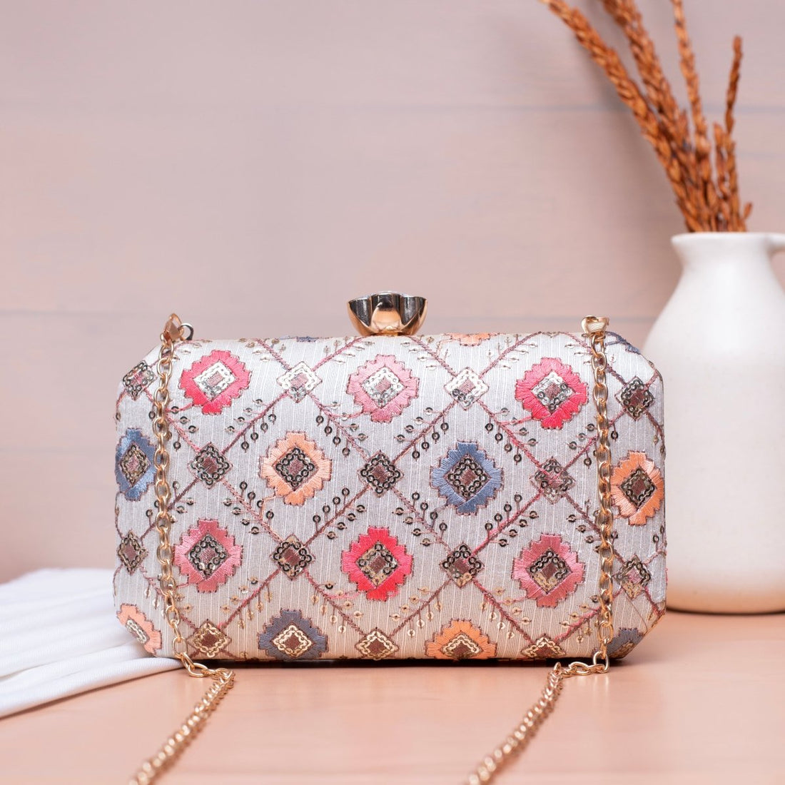 Artklim Off White Based Golden And Maroon Threadwork Embroidery Clutch