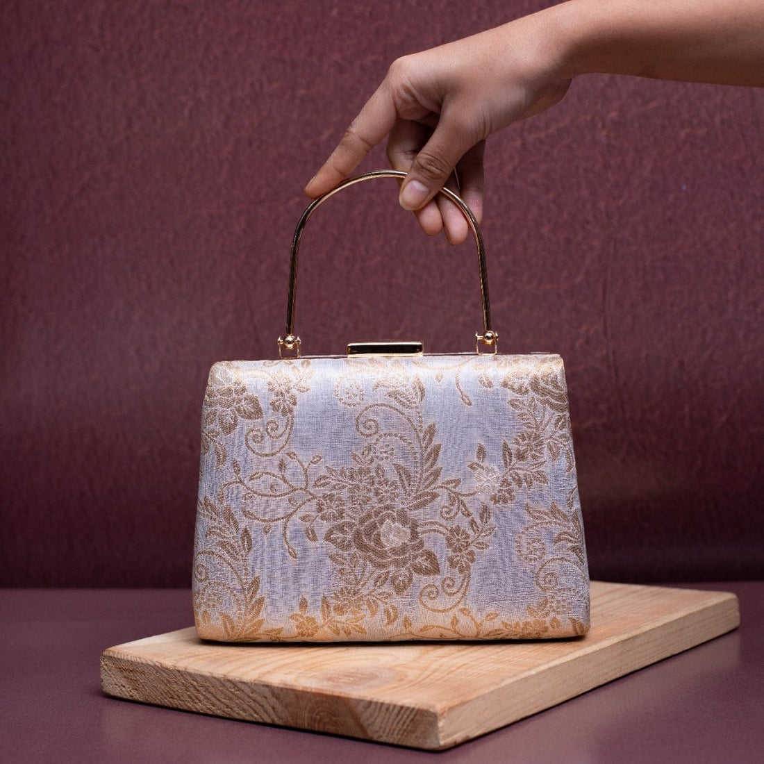 Artklim White Based Golden Floral Brocade Fabric Clutch