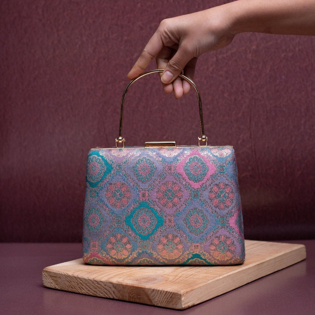 Artklim Blue Based Pattern Printed Silk Fabric Clutch