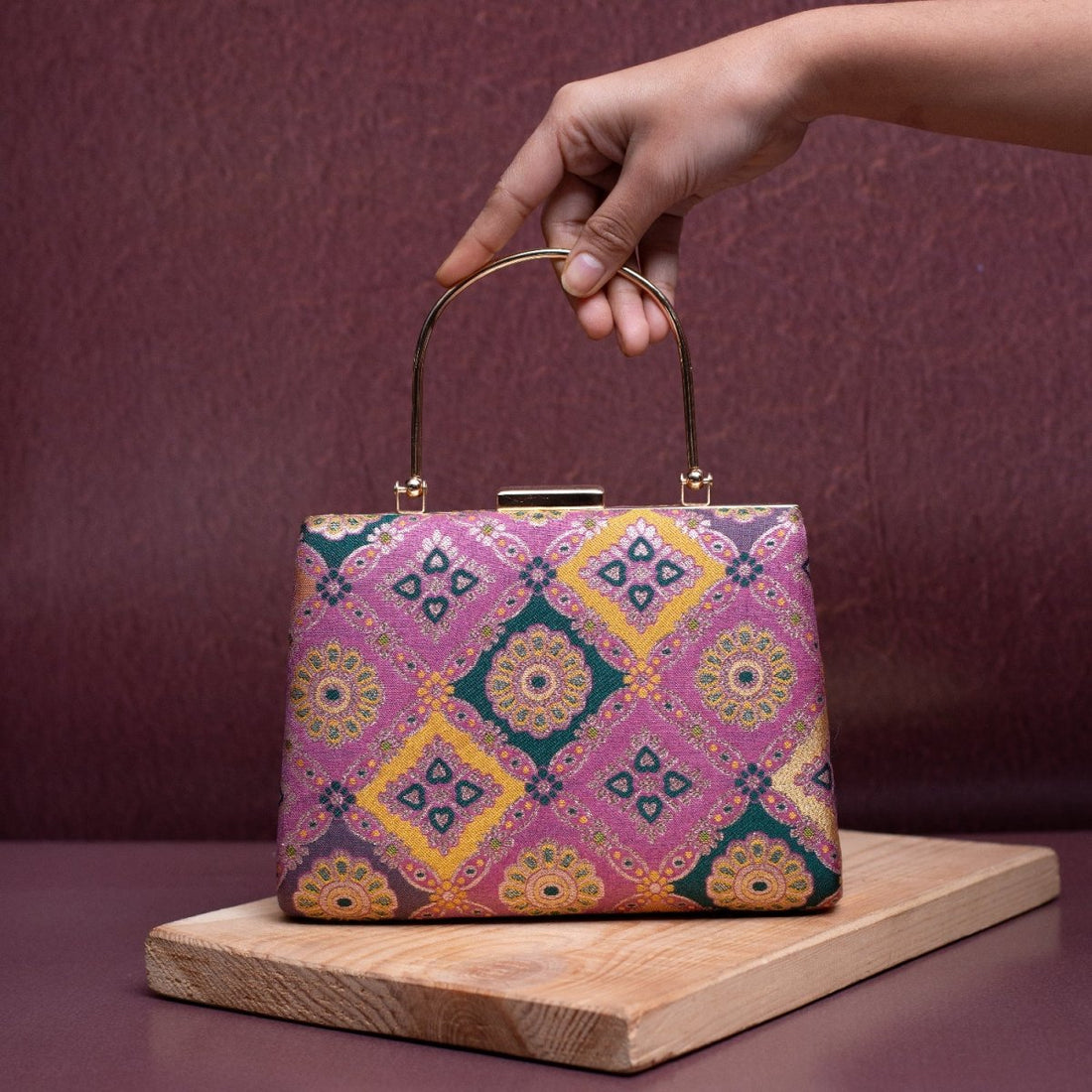 Artklim Pink Based Pattern Printed Silk Fabric Clutch