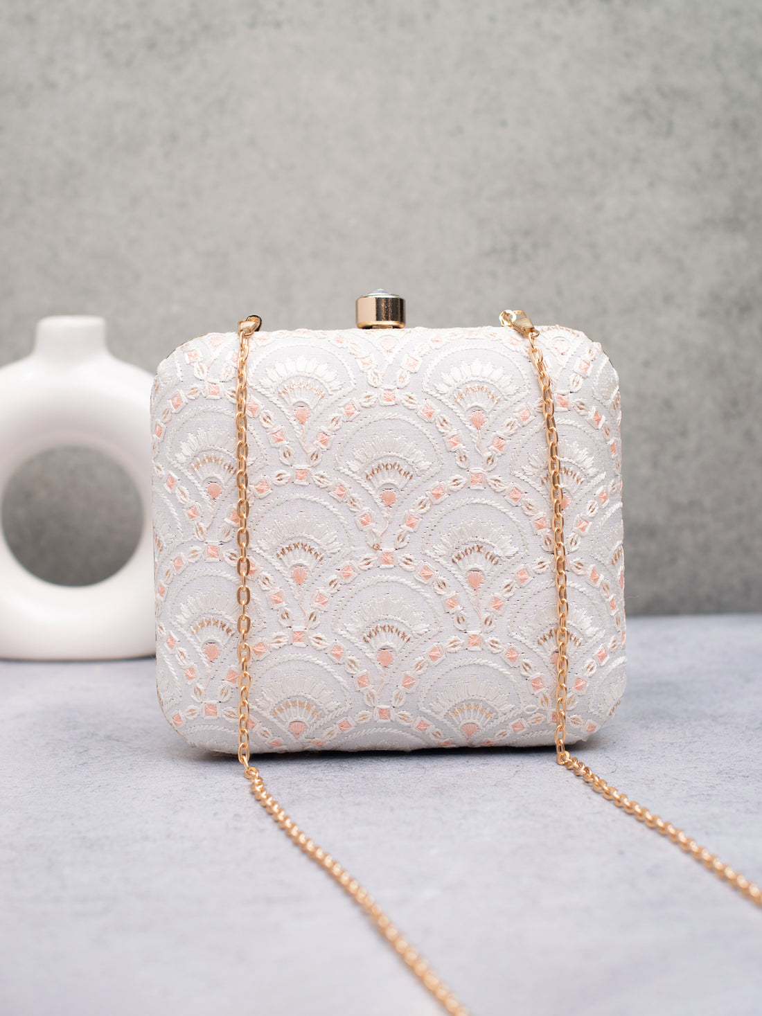 Artklim Off White Base Brown Threadwork Embroidery Capsule Clutch