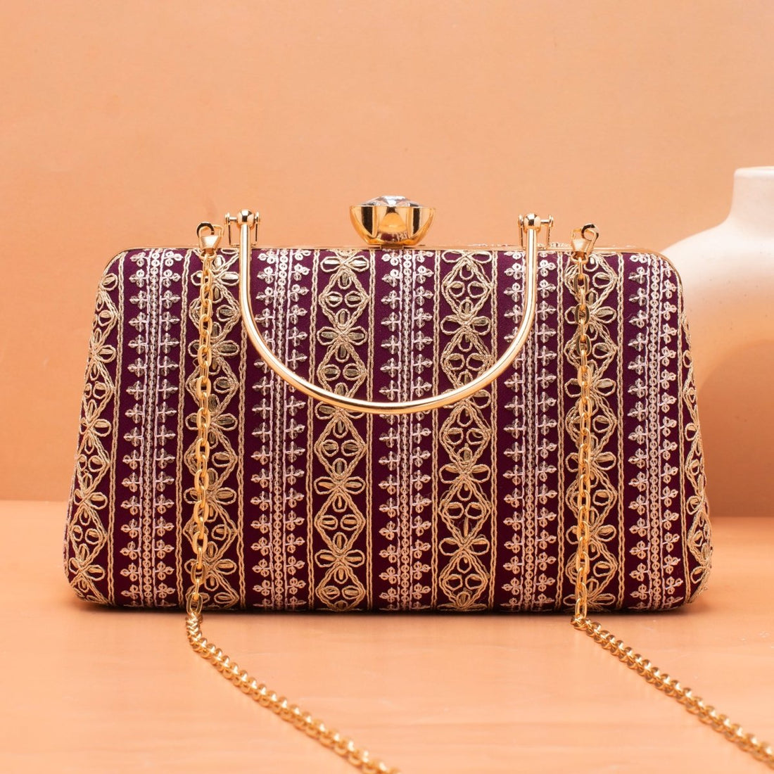 Artklim Wine Based White And Golden Threadwork Embroidery Clutch