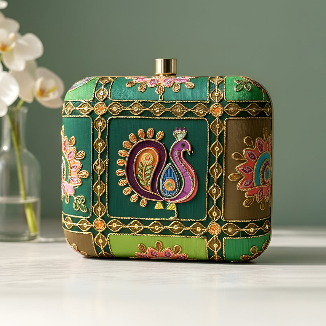 Artklim Royal Green Heritage Peacock Embroidered Clutch