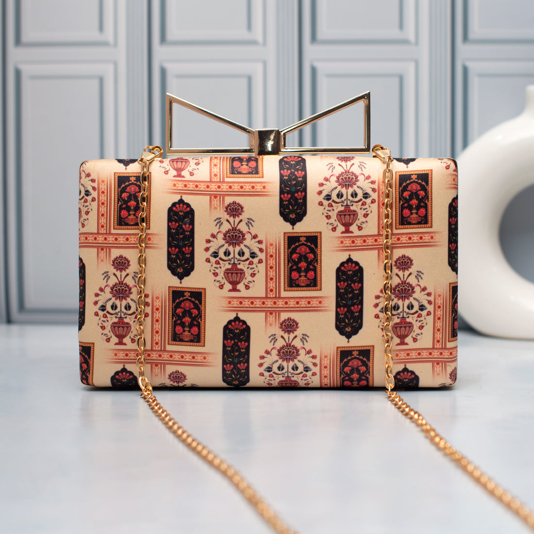 If you are looking for sober but fancy evening clutches, this clutch is the best choice. It suits all corporate parties and occasions and makes you feel special and different. The designer clasp with the shiny logo of the Taj Mahal gives it a different look.