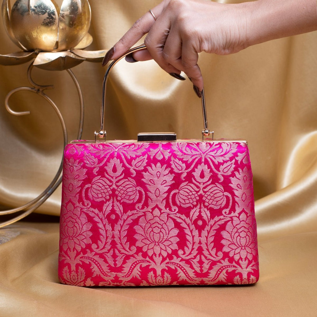 Artklim Pink Based Silver Pattern Printed Brocade Fabric Clutch