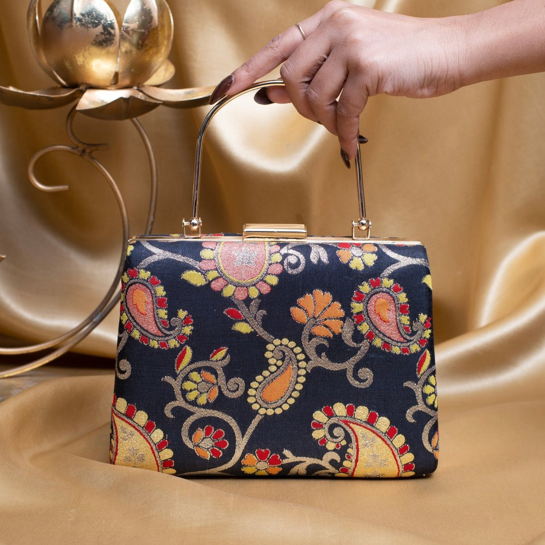Artklim Black Based Multicolored Pattern Printed Brocade Fabric Clutch