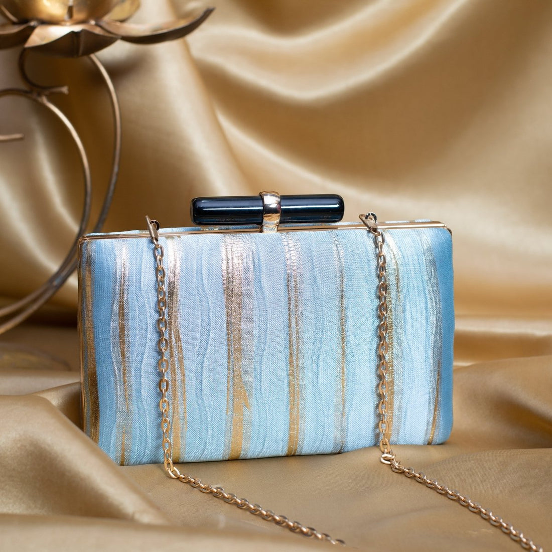 Artklim Pastel Blue And Golden Based Crushed Satin Fabric Clutch