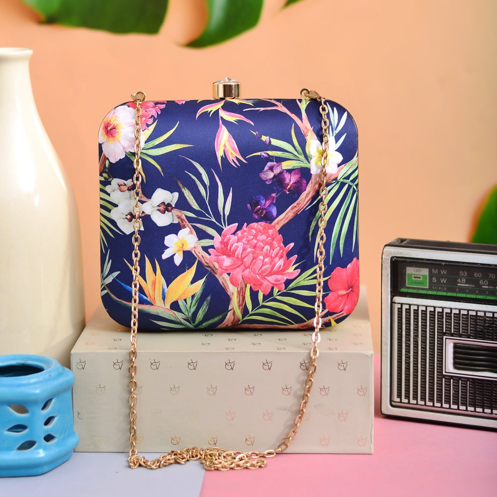 Dark Blue Floral Printed Clutch