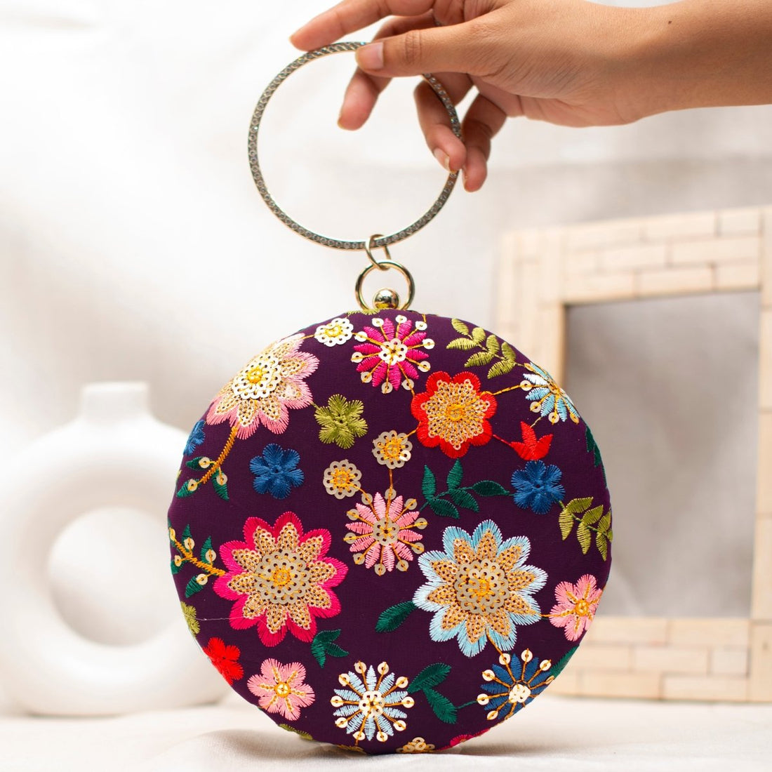 Wine Floral Embroidery Round Clutch