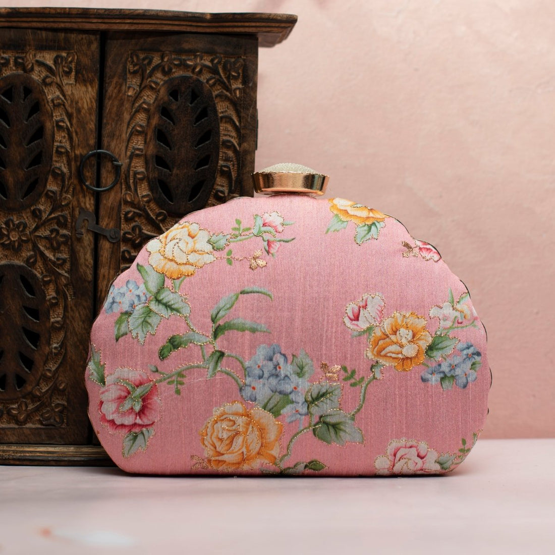 Pink Floral Printed Zari Embroidery Clutch