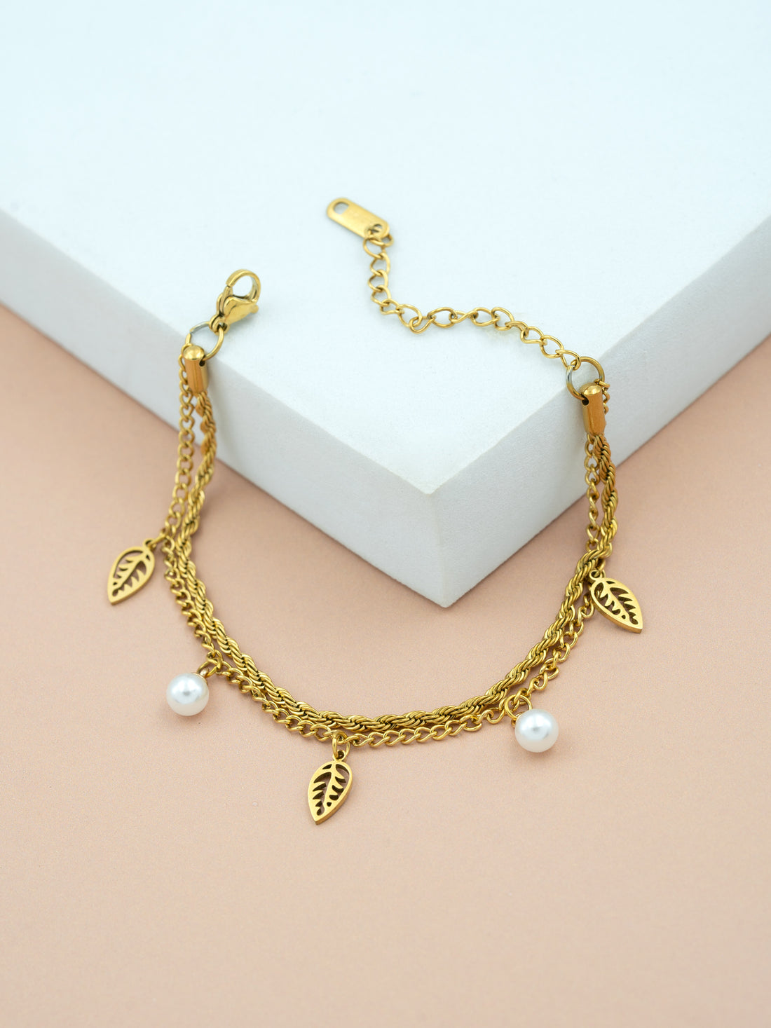 Artklim Gold Plated Anti Tarnish Golden Leaf & Pearl Charm Bracelet