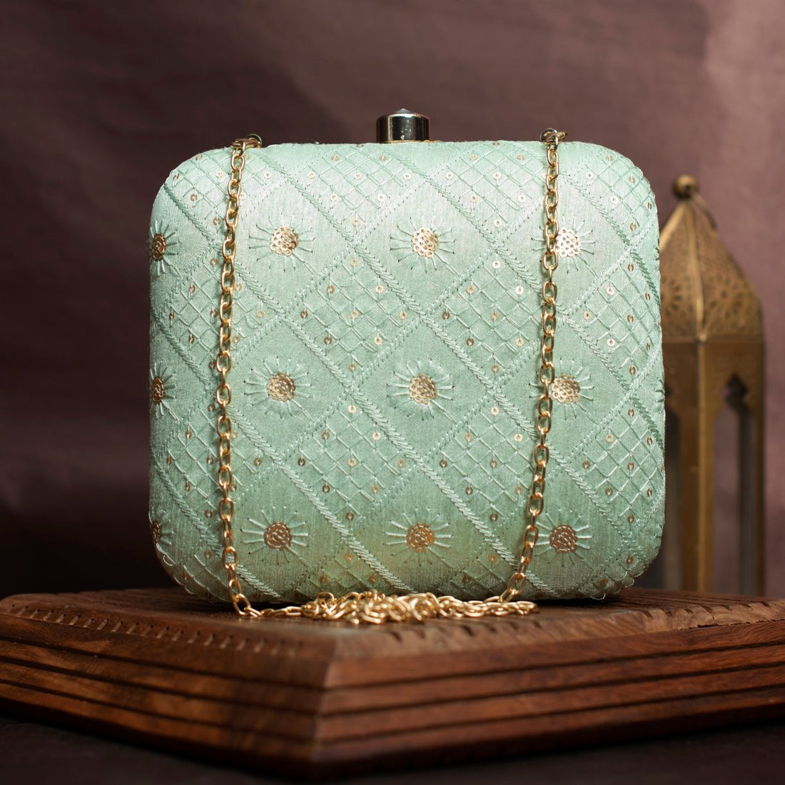 Turquoise Box Pattern Sequins Embroidery Clutch