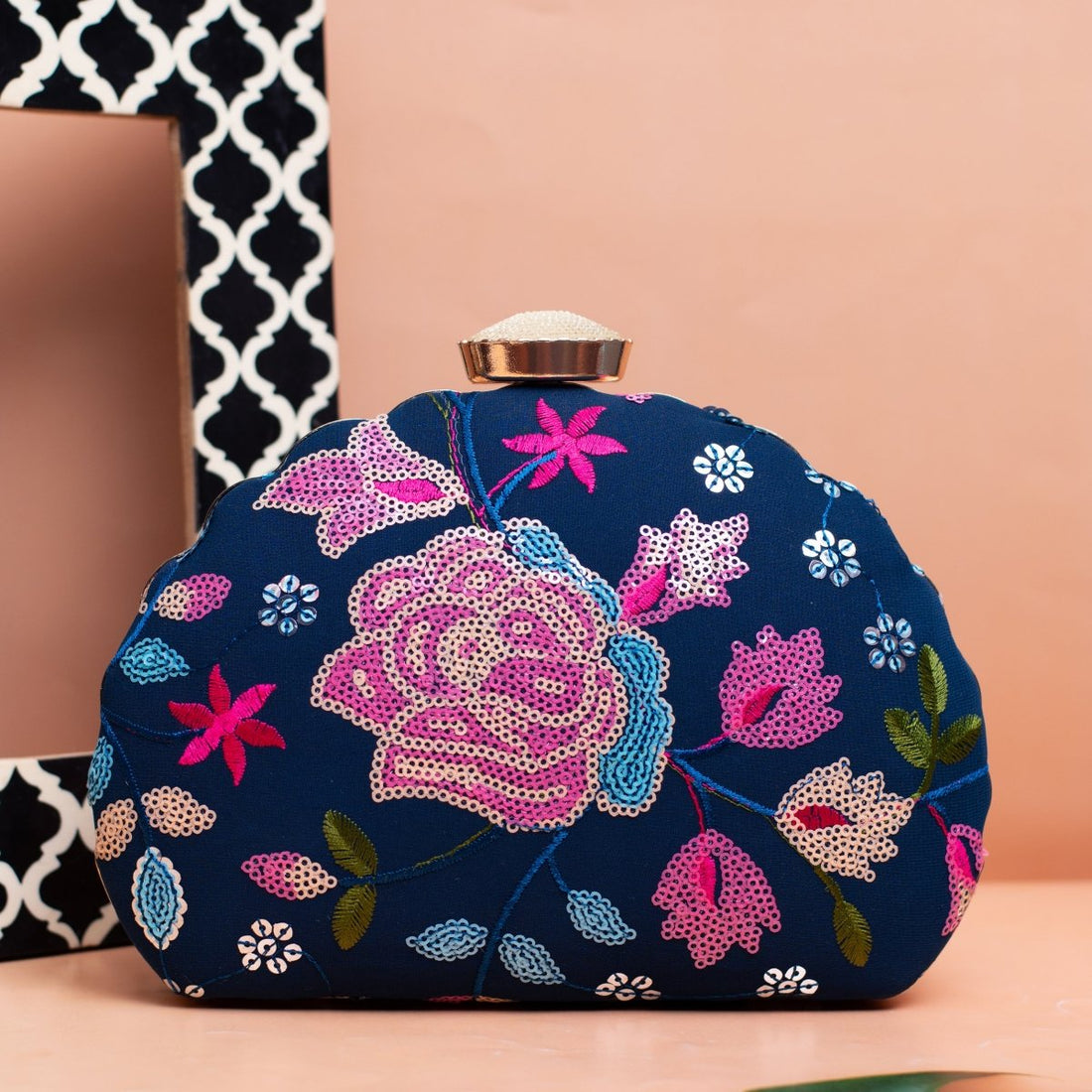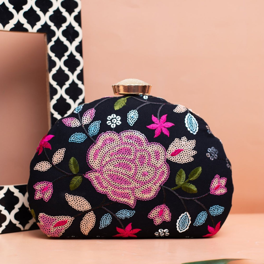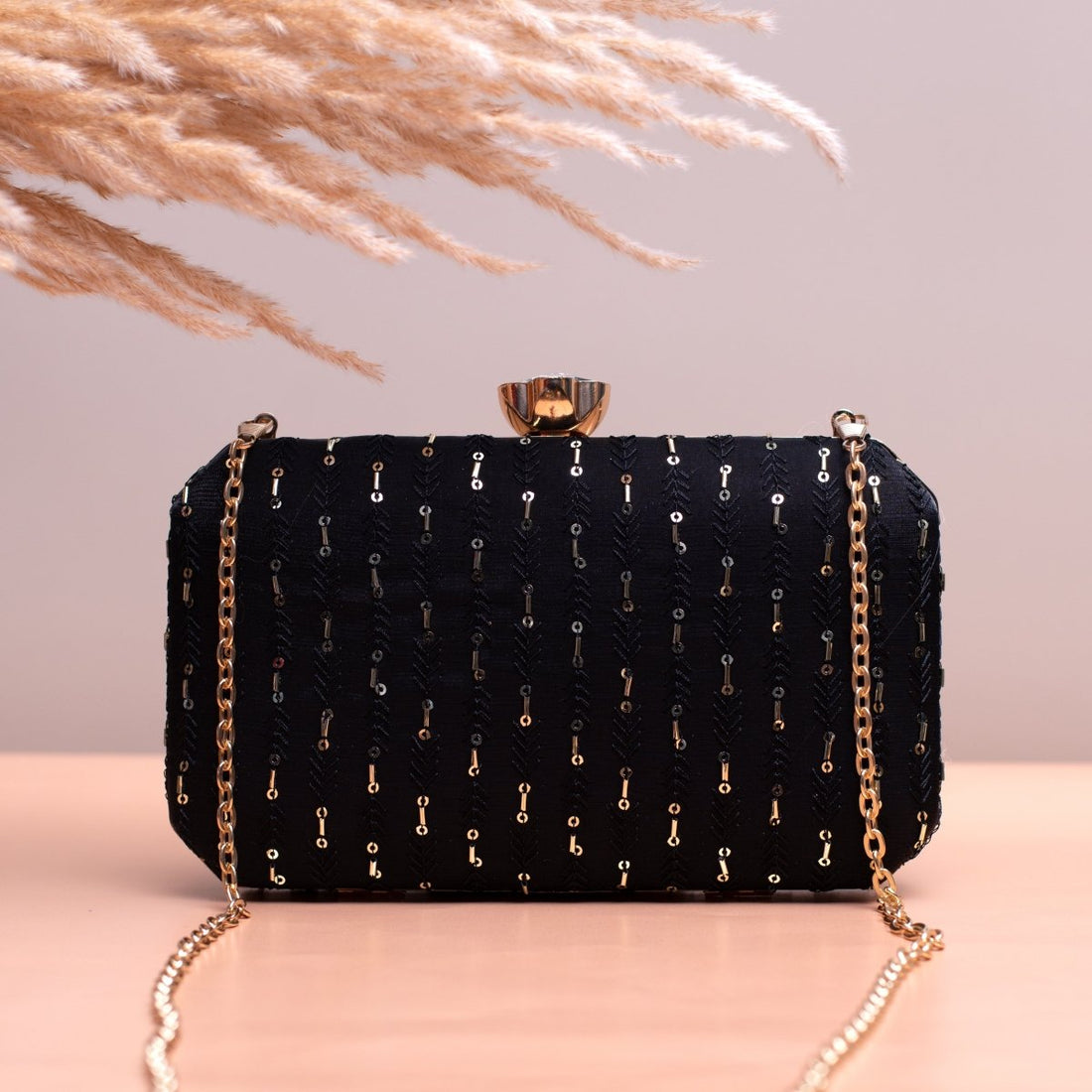 Black Zigzag Sequins Embroidery Fabric Clutch