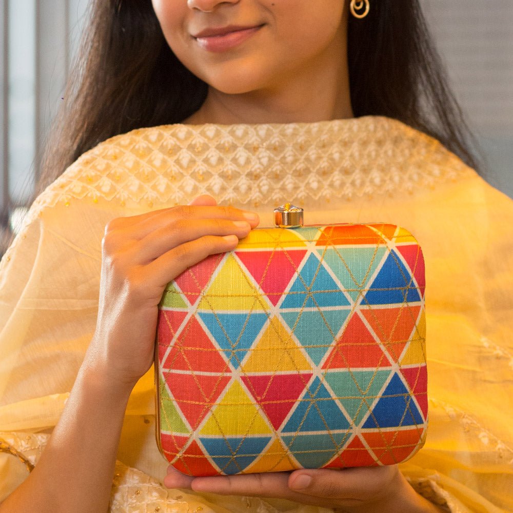 Diamond Shaped Multi-Coloured Printed Pattern Clutch.