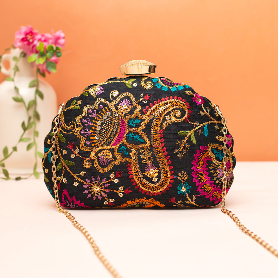 Artklim Royal Black Sequins Embroidery D- Shape Clutch"