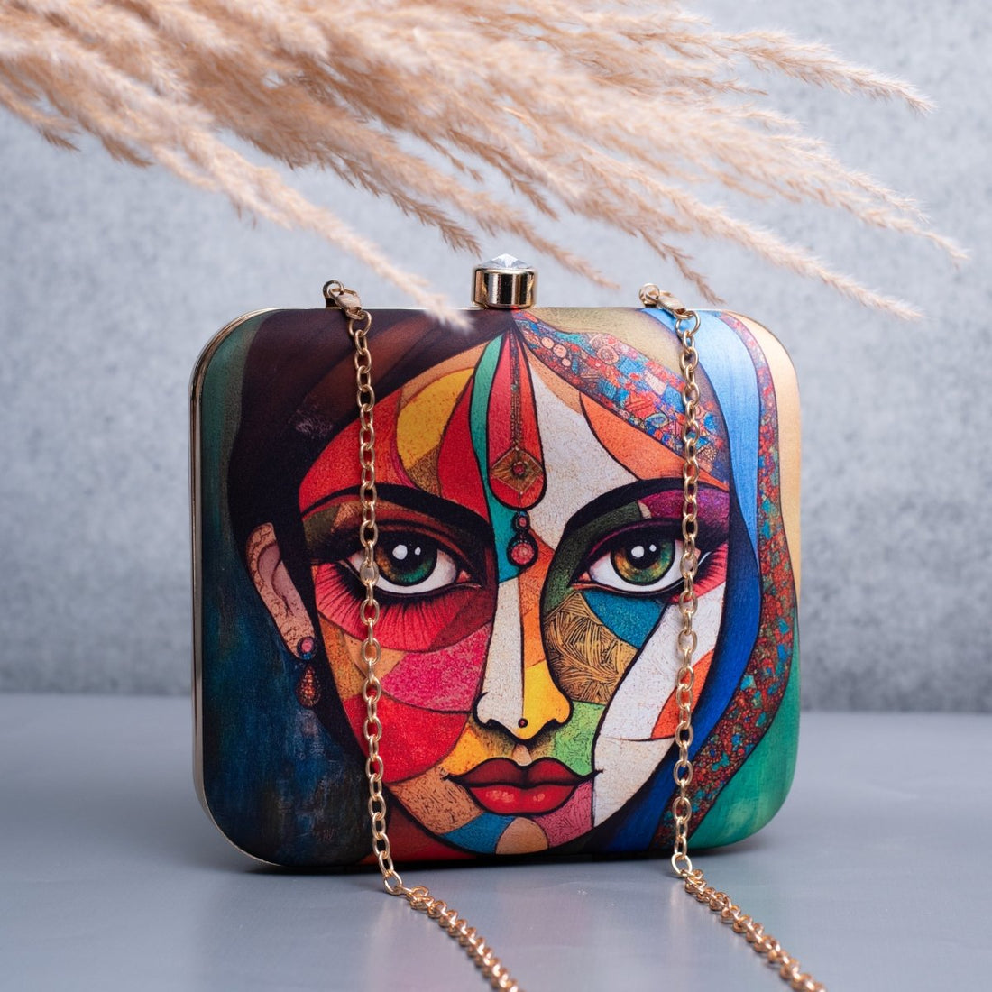 Artklim Beige Based Portrait Of Indian Lady Printed Clutch