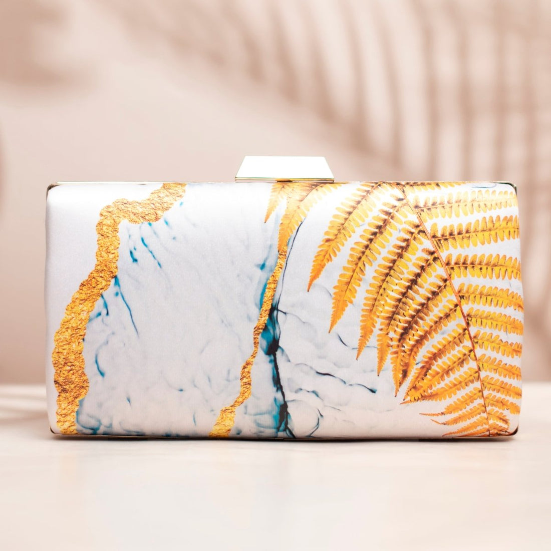 White And Golden Leaf Printed Clutch