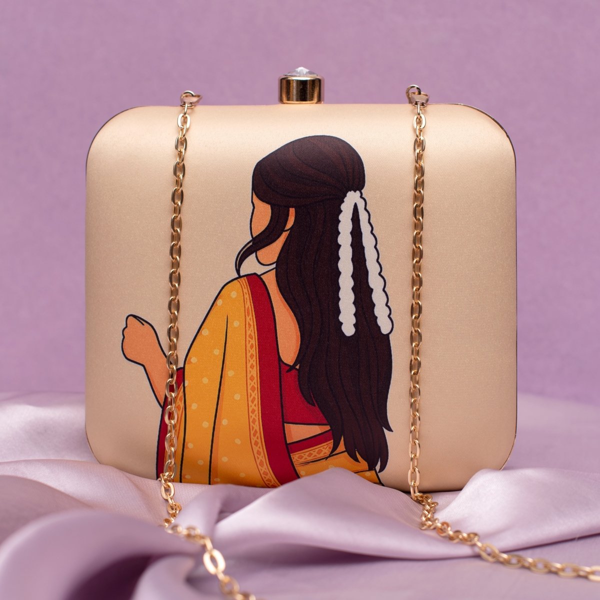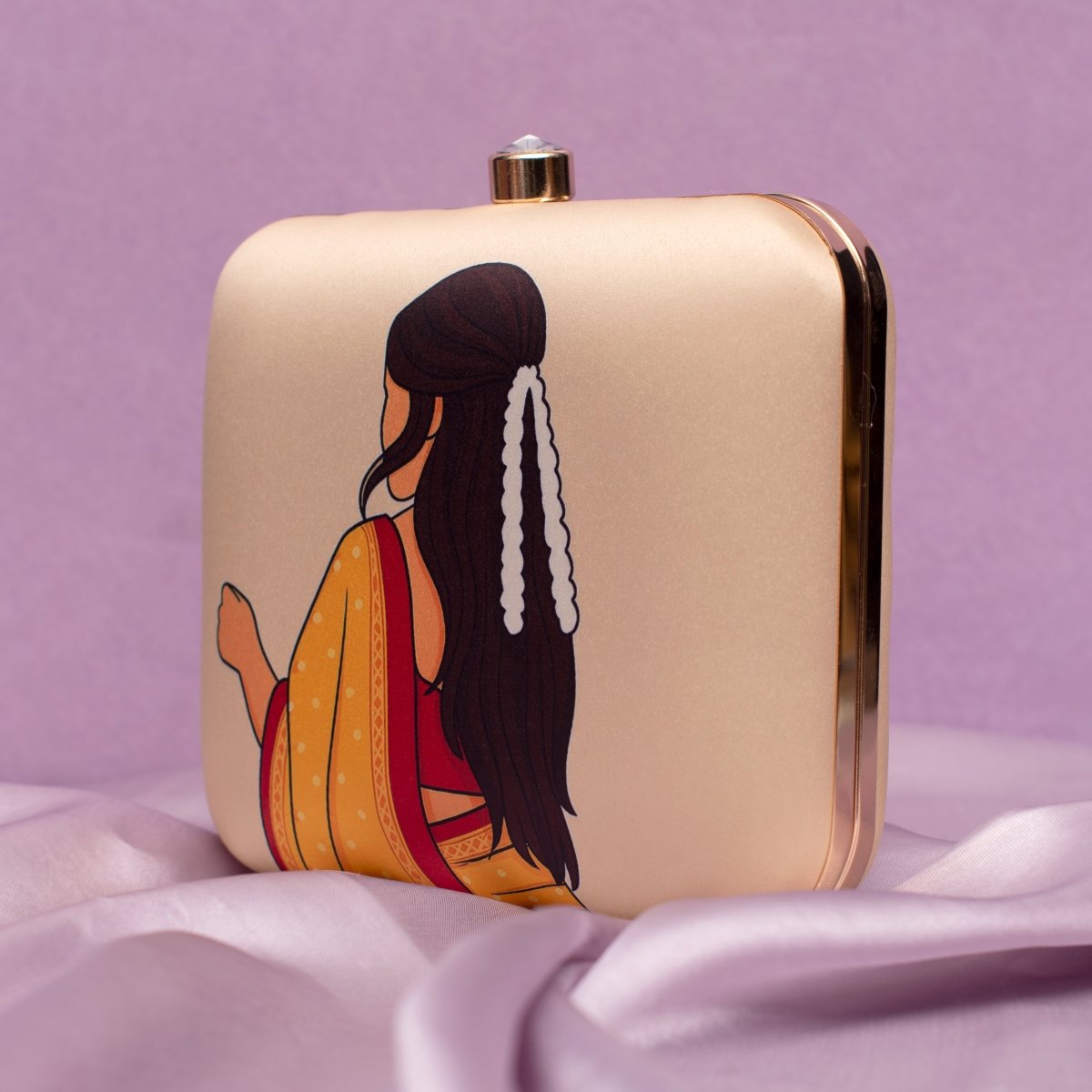 Artklim Beige Based Mustard Saree Woman With Gajra Portrait Printed Clutch