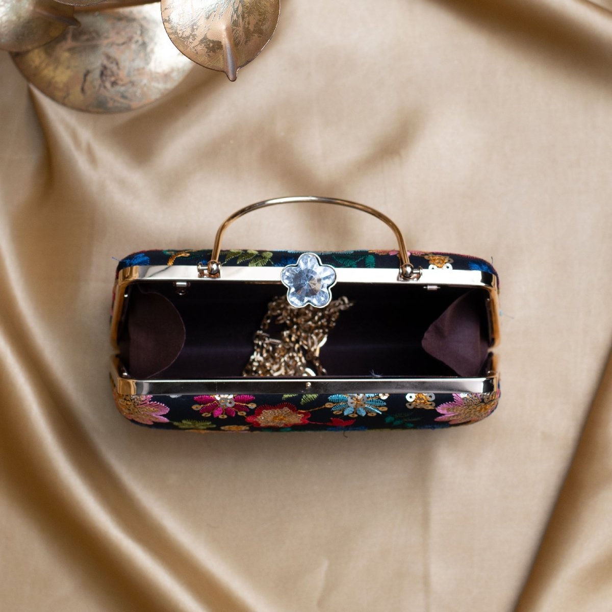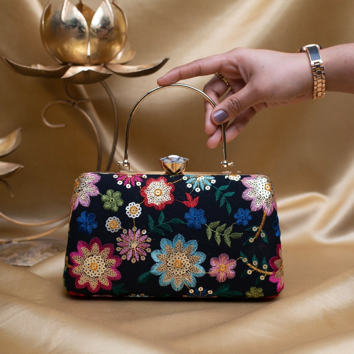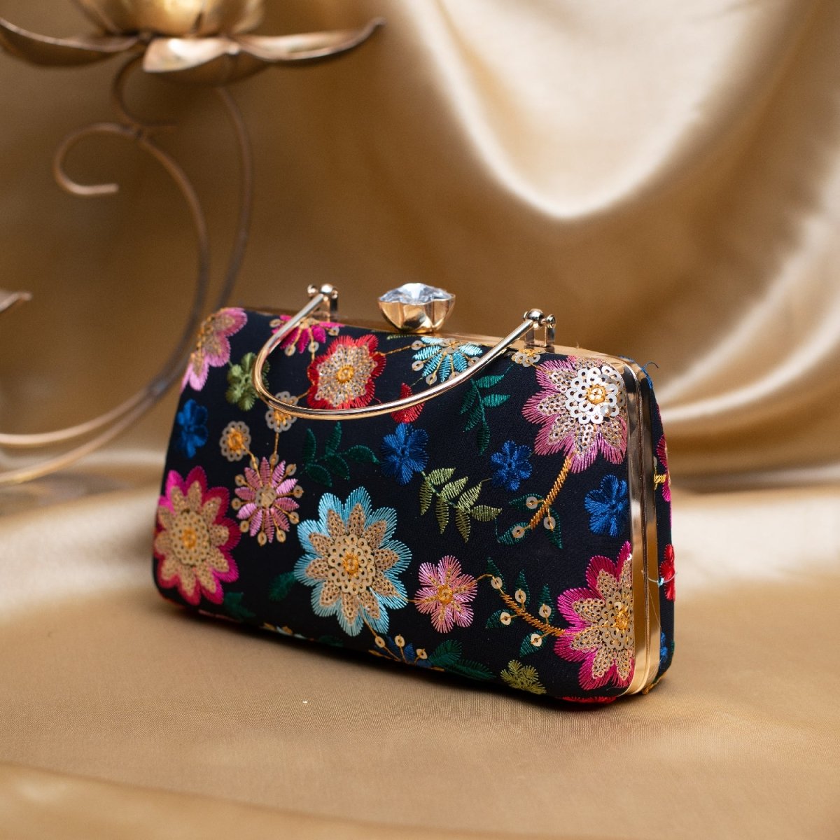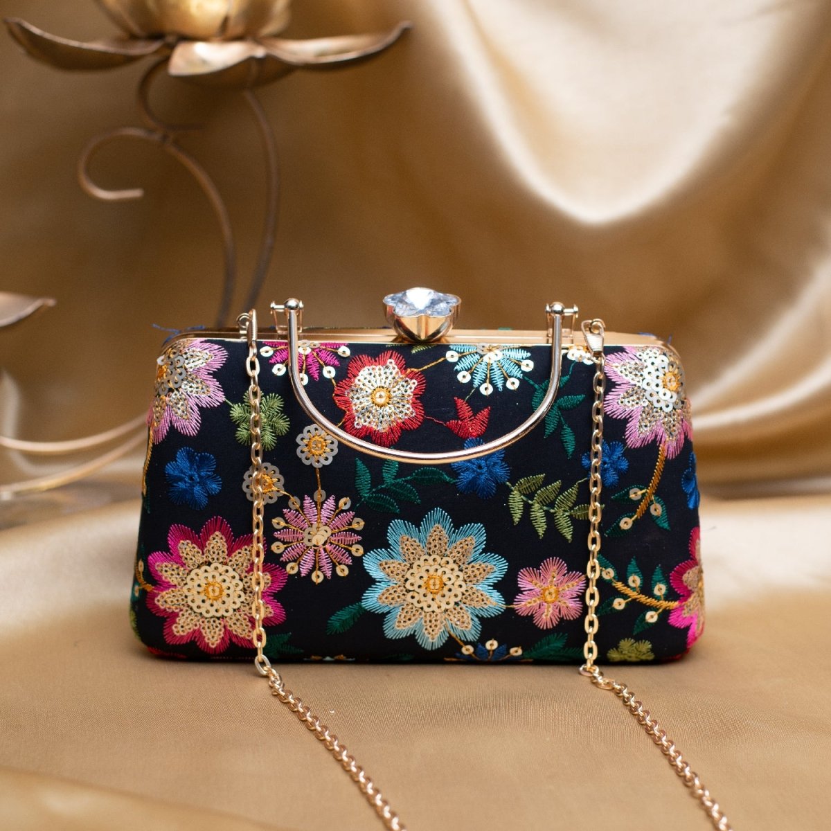 Artklim Black Based Multicoloured Floral Embroidery Clutch