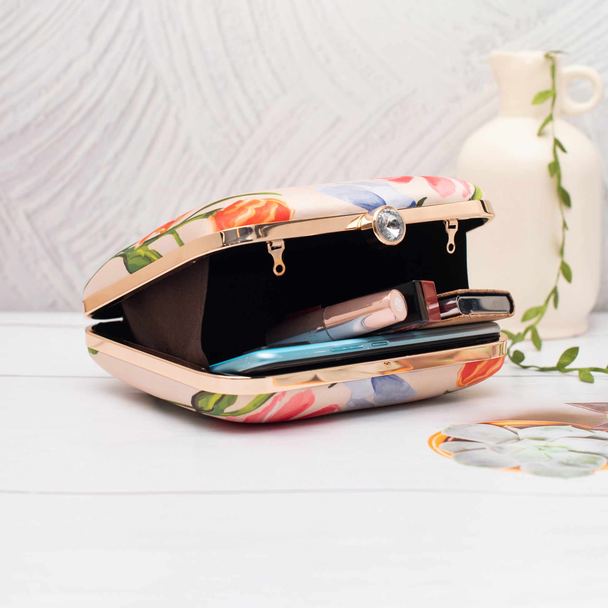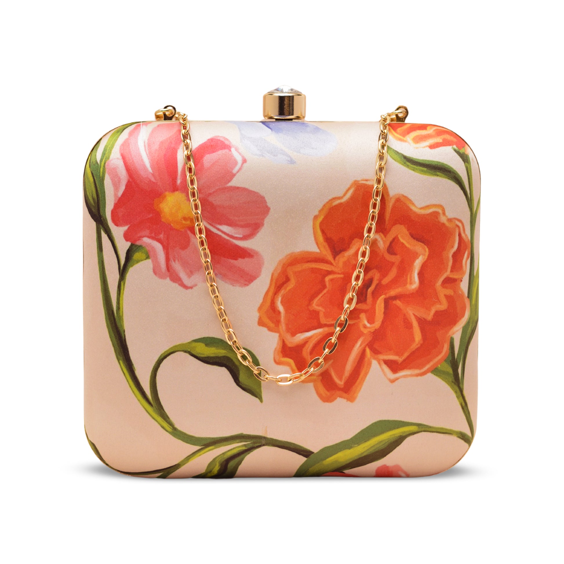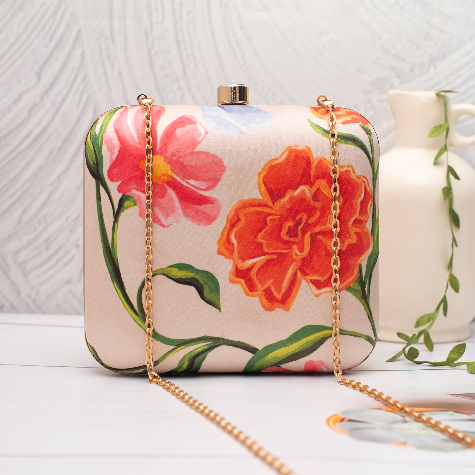Add a burst of personality to every outing with these handcrafted clutches. Designed to blend fashion and art, each piece is a mini canvas—printed with vibrant illustrations, finished with a luxe hard-case body, and accented with a gleaming gold clasp and chain