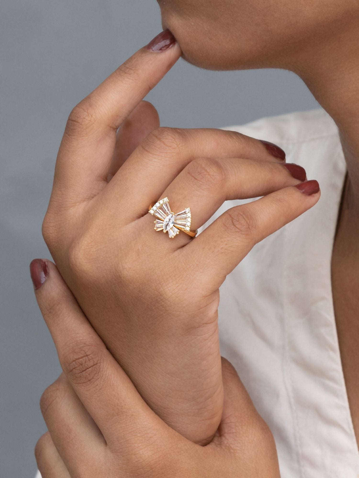 Add a touch of elegance to your look with this beautifully crafted designer ring. It features high-quality stones set in durable, skin-friendly metal.