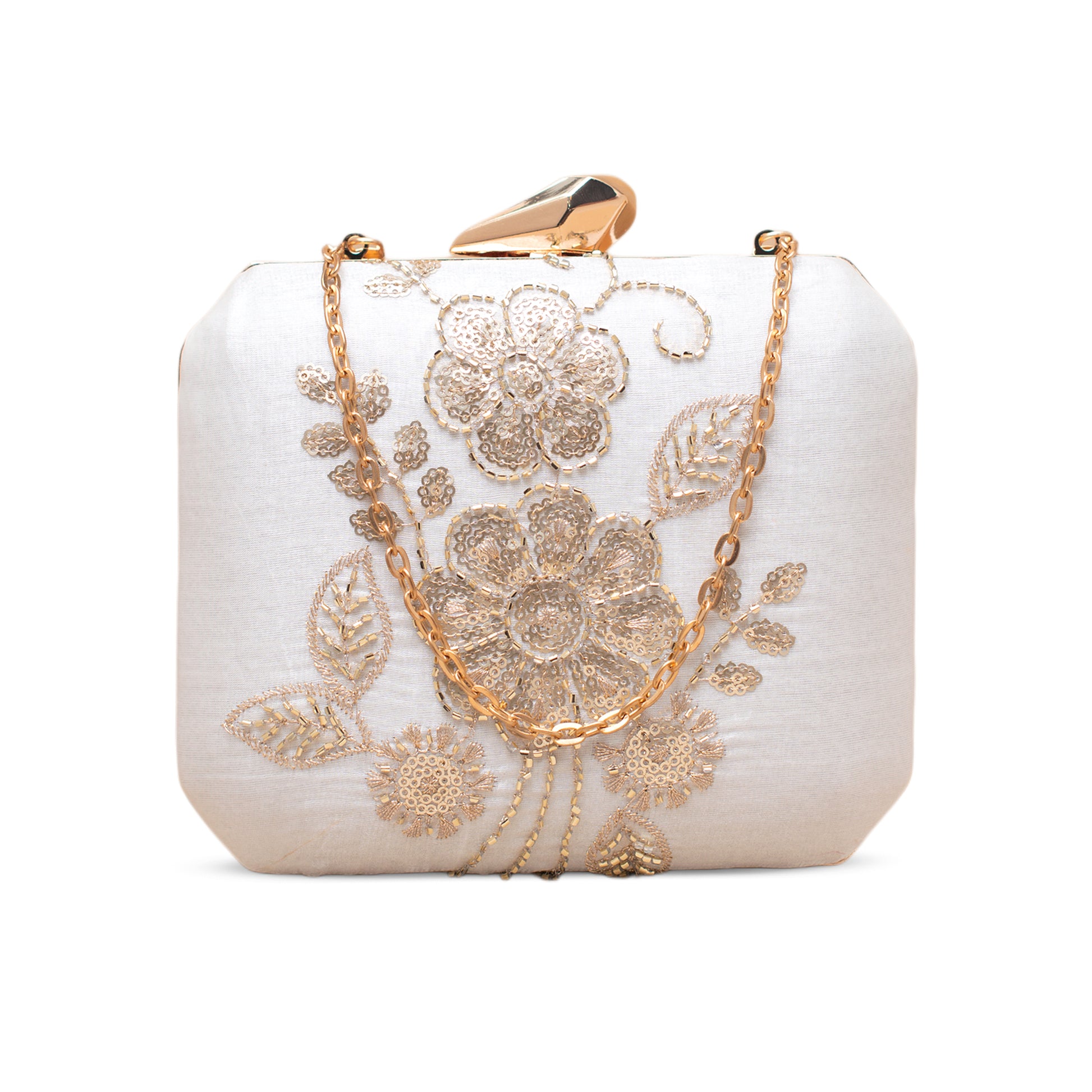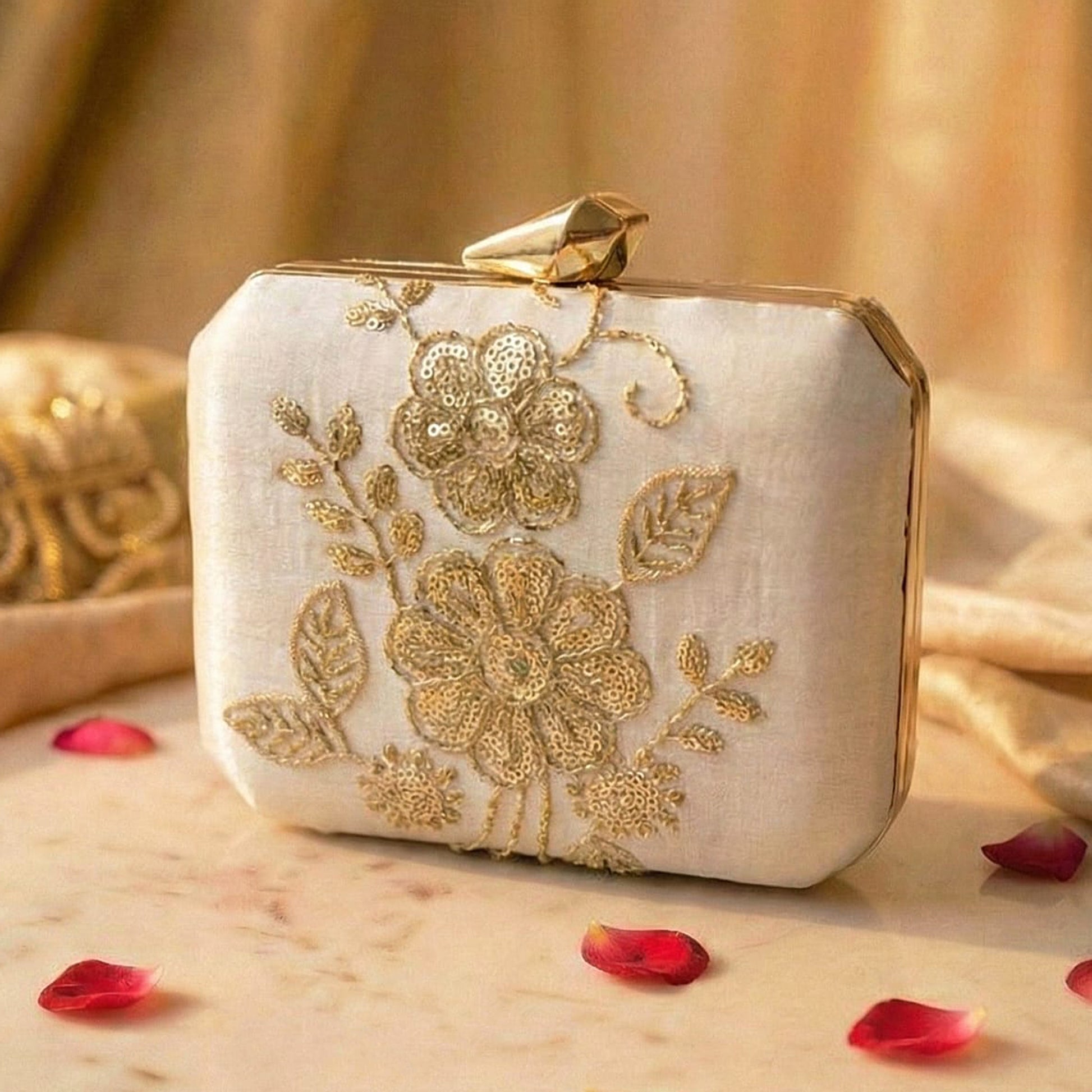 Add a burst of personality to every outing with these handcrafted clutches. Designed to blend fashion and art, each piece is a mini canvas—Embroided finished with a luxe hard-case body, and accented with a gleaming gold clasp and chain.