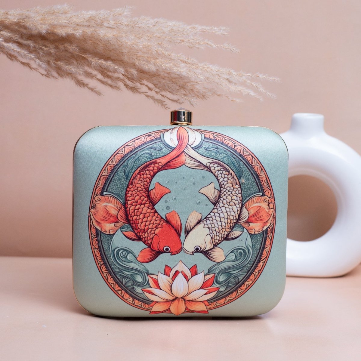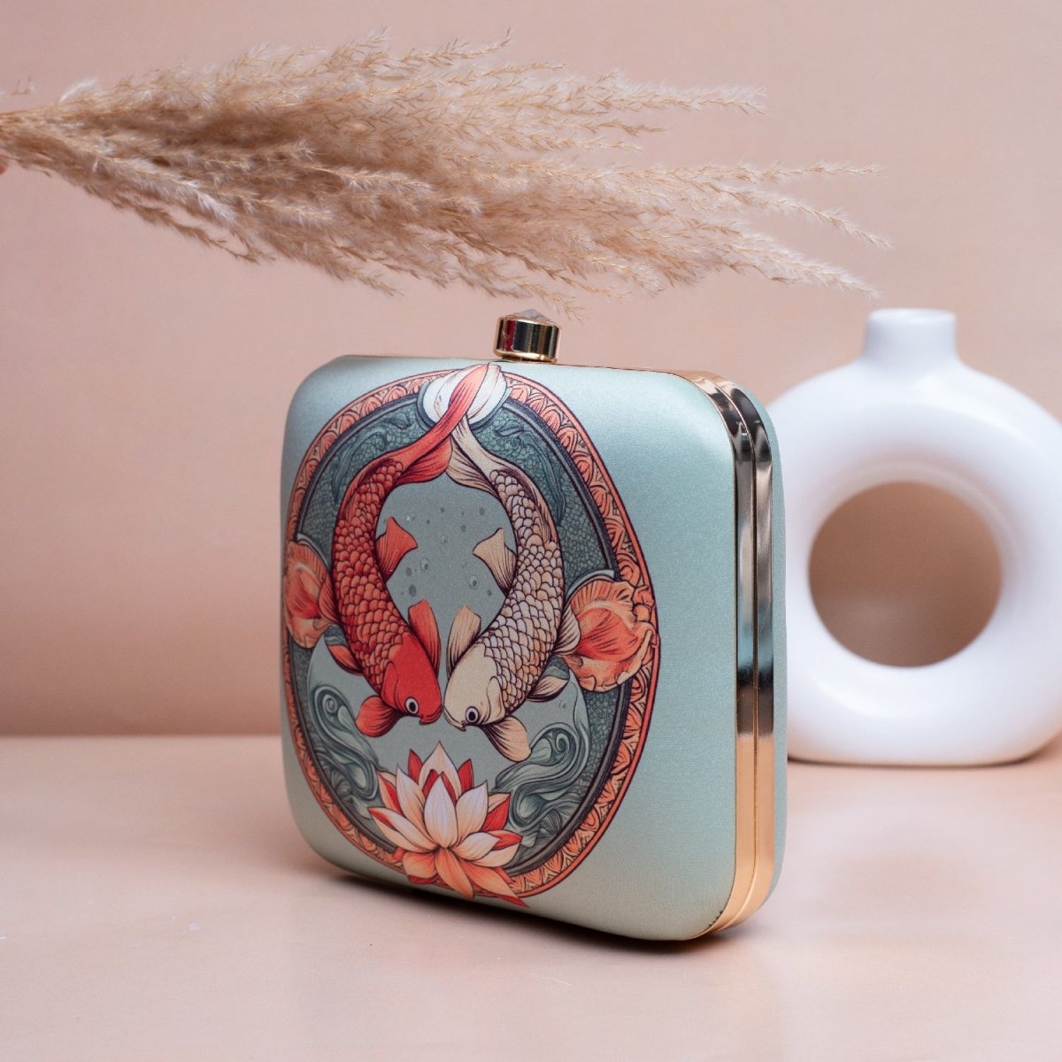 Artklim Light Blue Based Koi Fish Printed Clutch