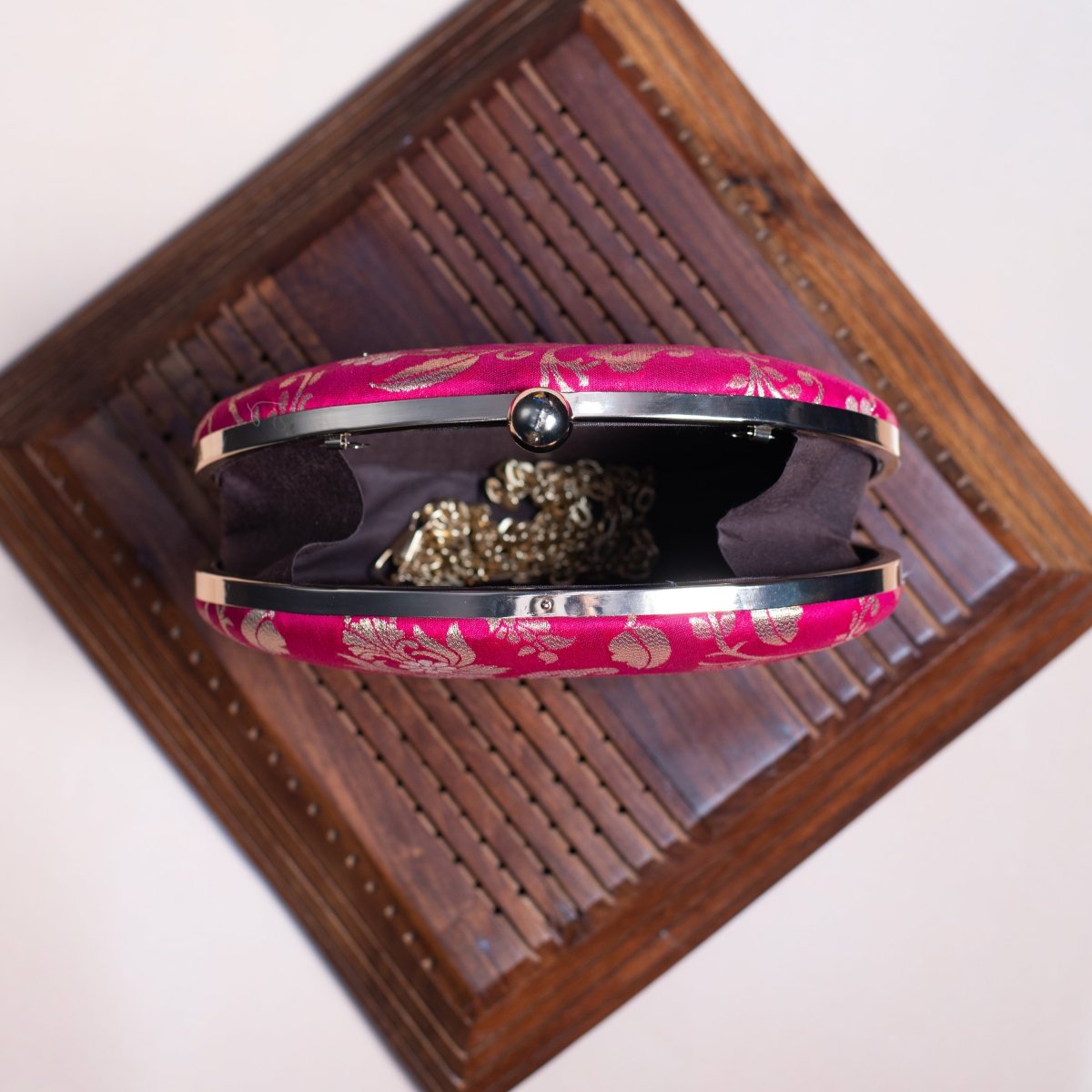 Artklim Magenta Pink Based Silver Floral Pattern Brocade Fabric Oval Clutch