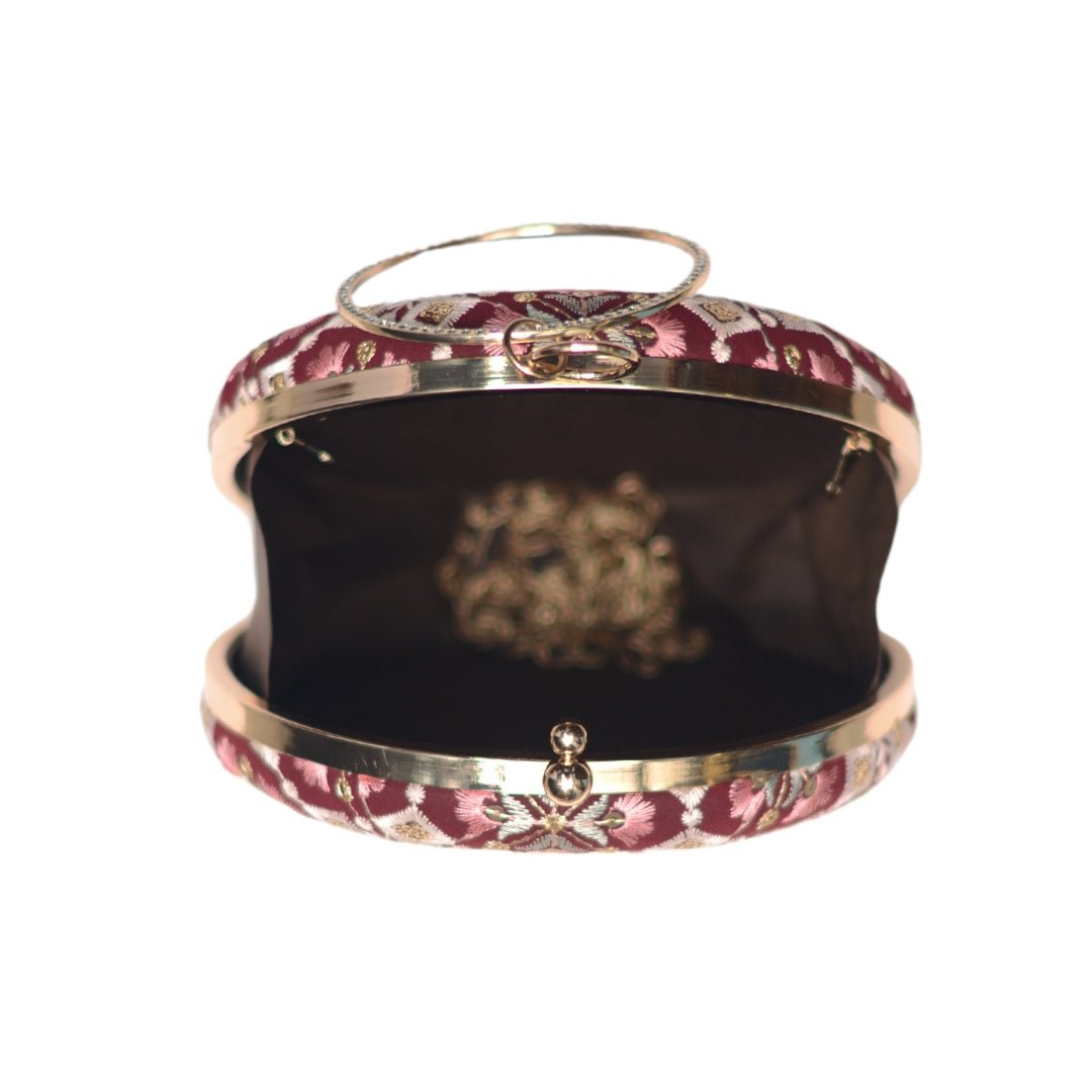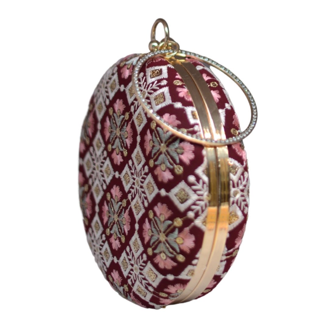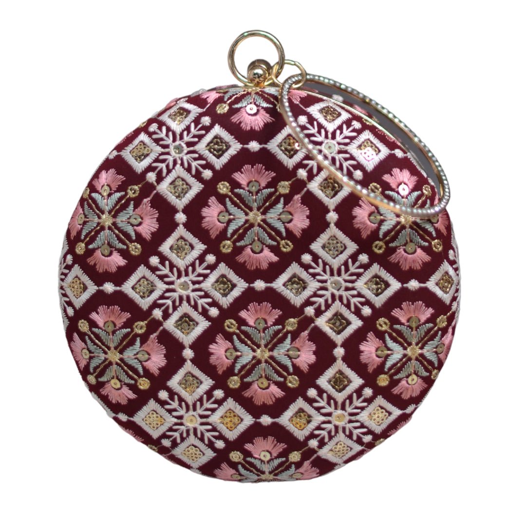 Maroon And Pink Floral Embroidery Round Clutch