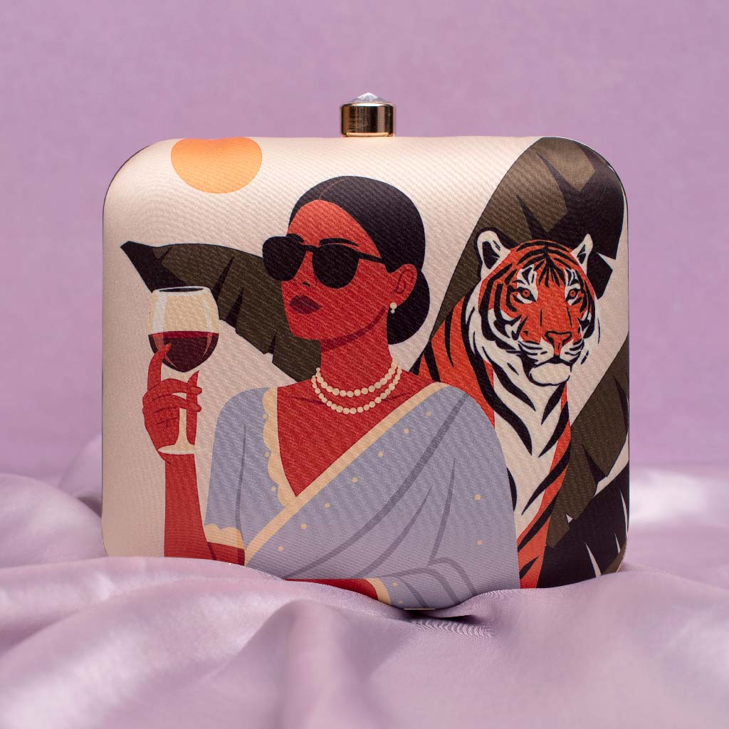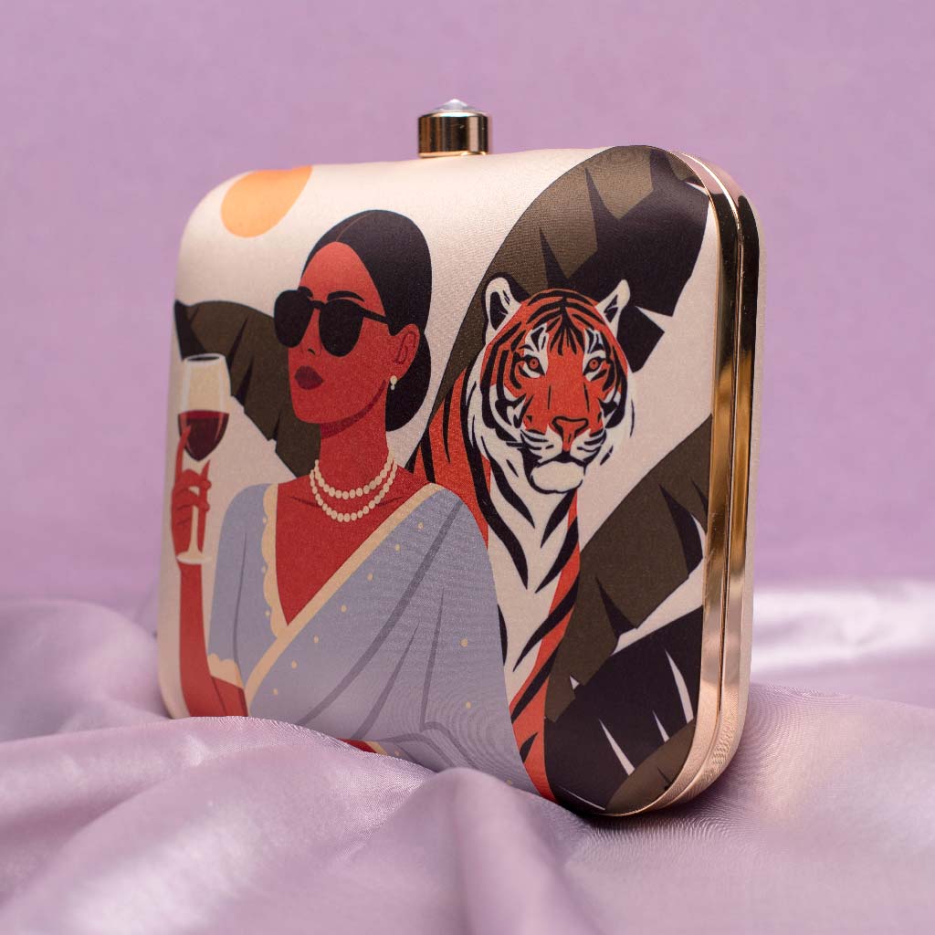 Artklim Off White Based Woman With Tiger Printed Clutch