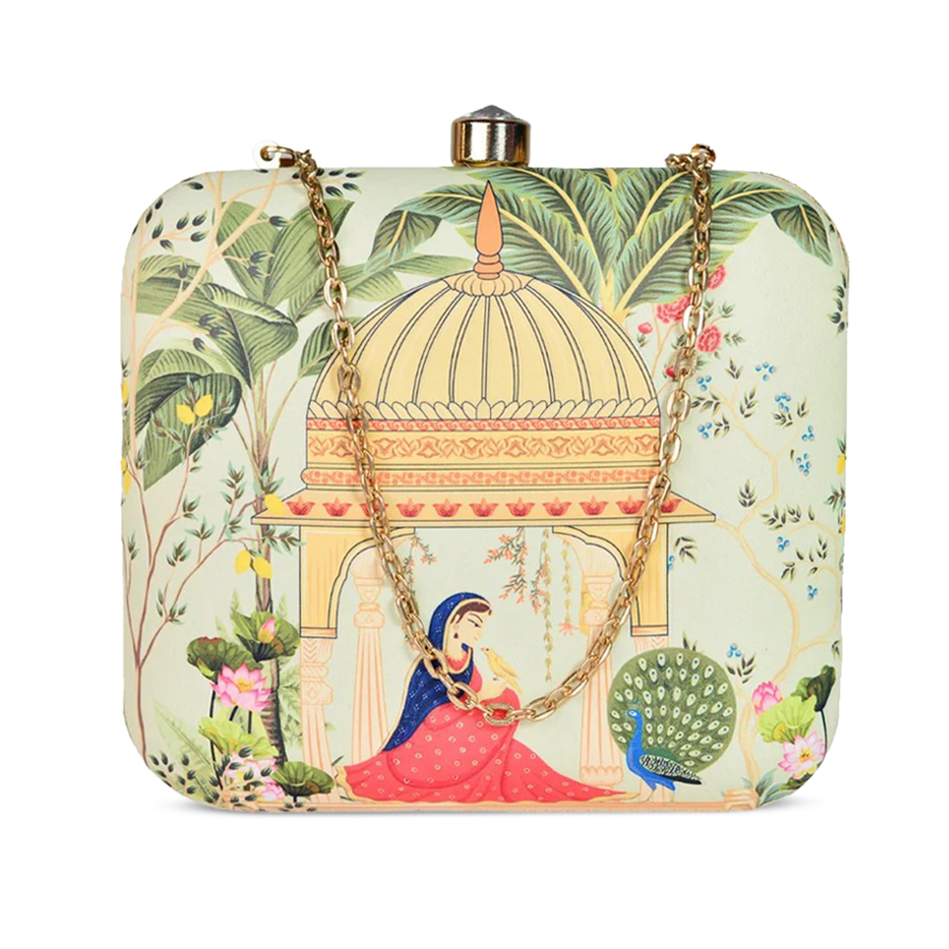 Crafted from premium satin digital print fabric, this artistic clutch features a structured metal frame with a crystal stone lock and a detachable sling chain. The raw silk interior adds a luxe feel.