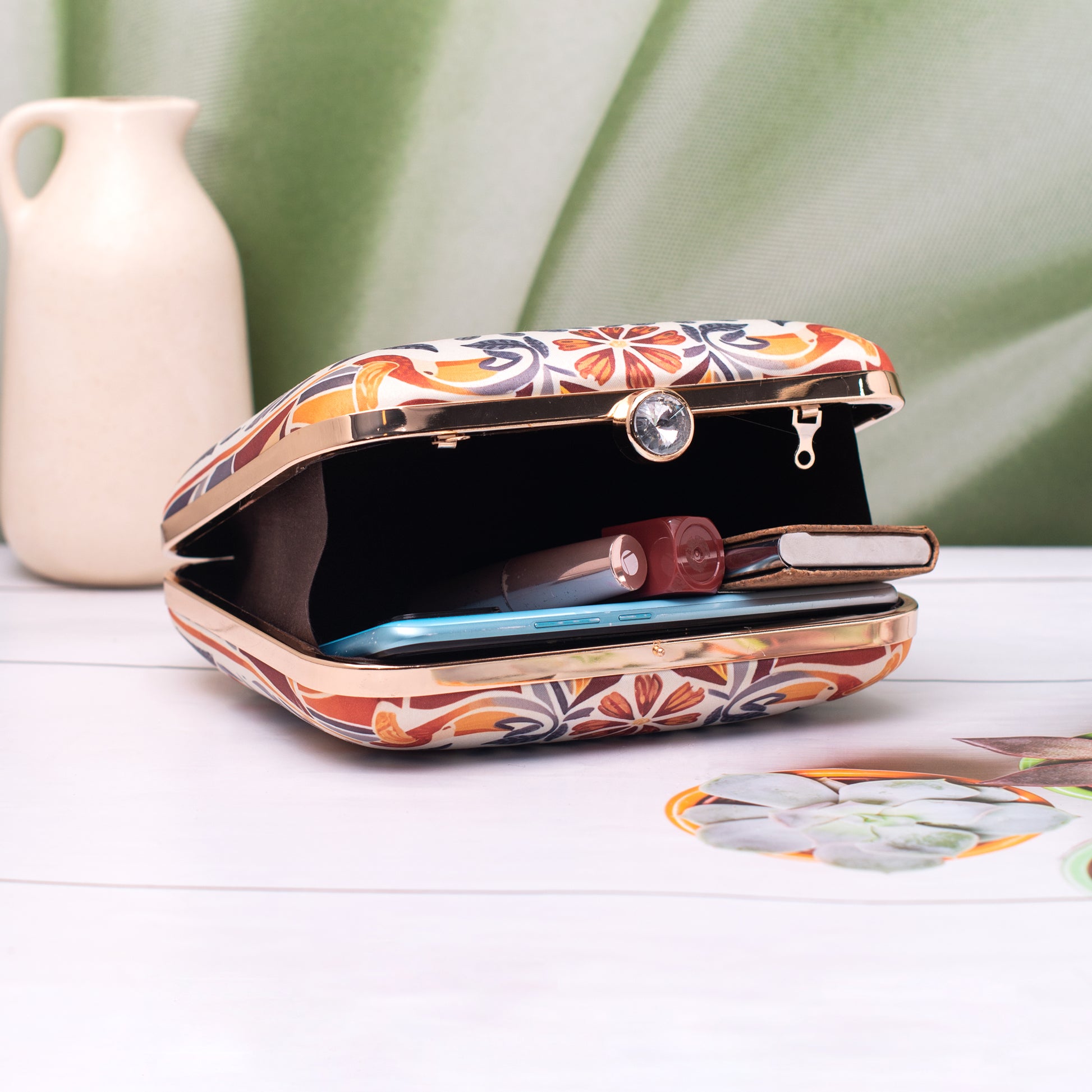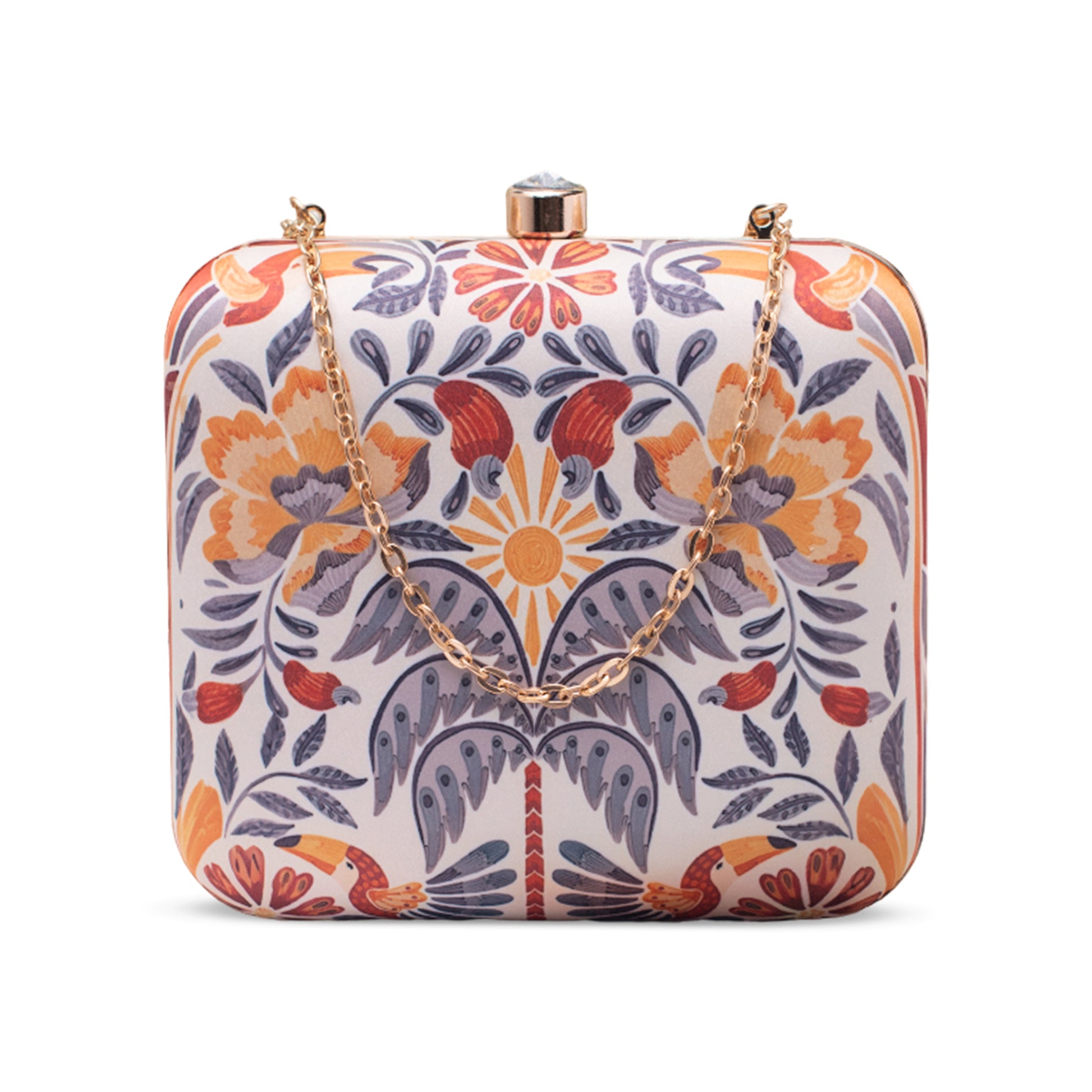 Add a burst of personality to every outing with these handcrafted clutches. Designed to blend fashion and art, each piece is a mini canvas—printed with vibrant illustrations, finished with a luxe hard-case body, and accented with a gleaming gold clasp and chain