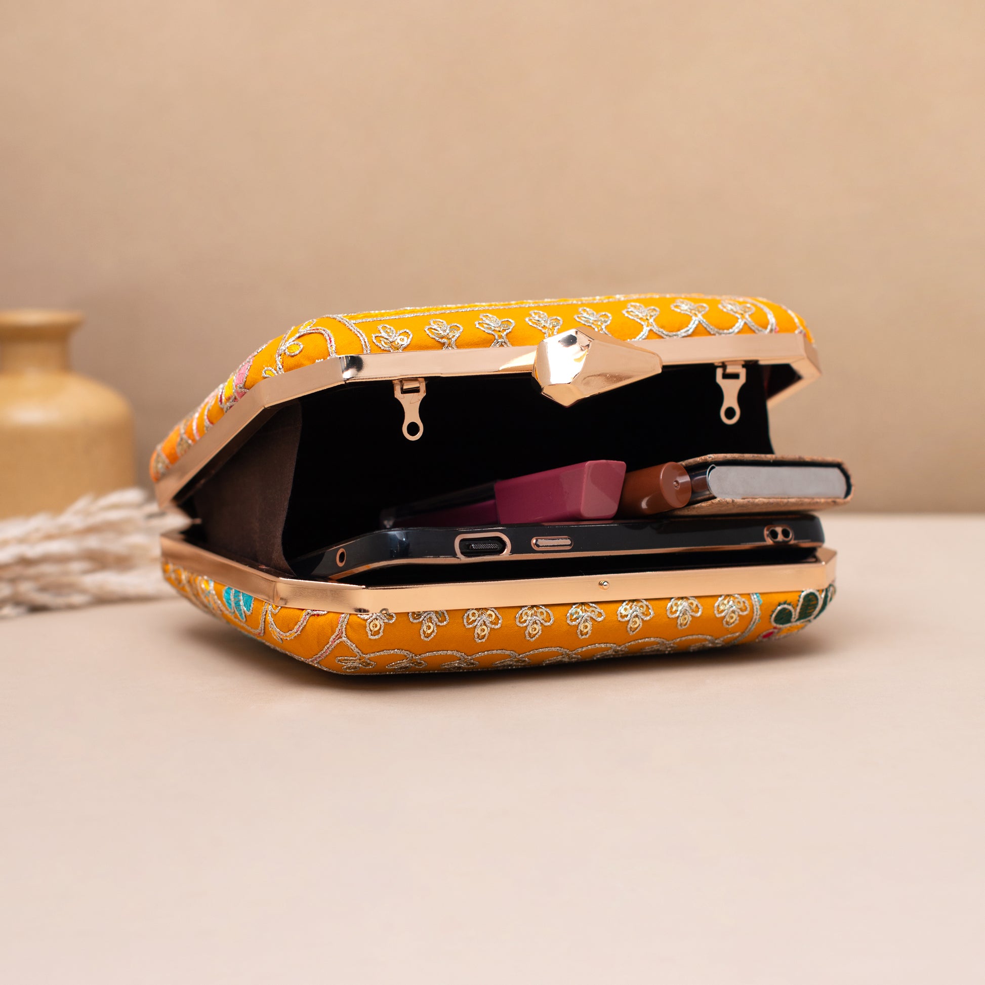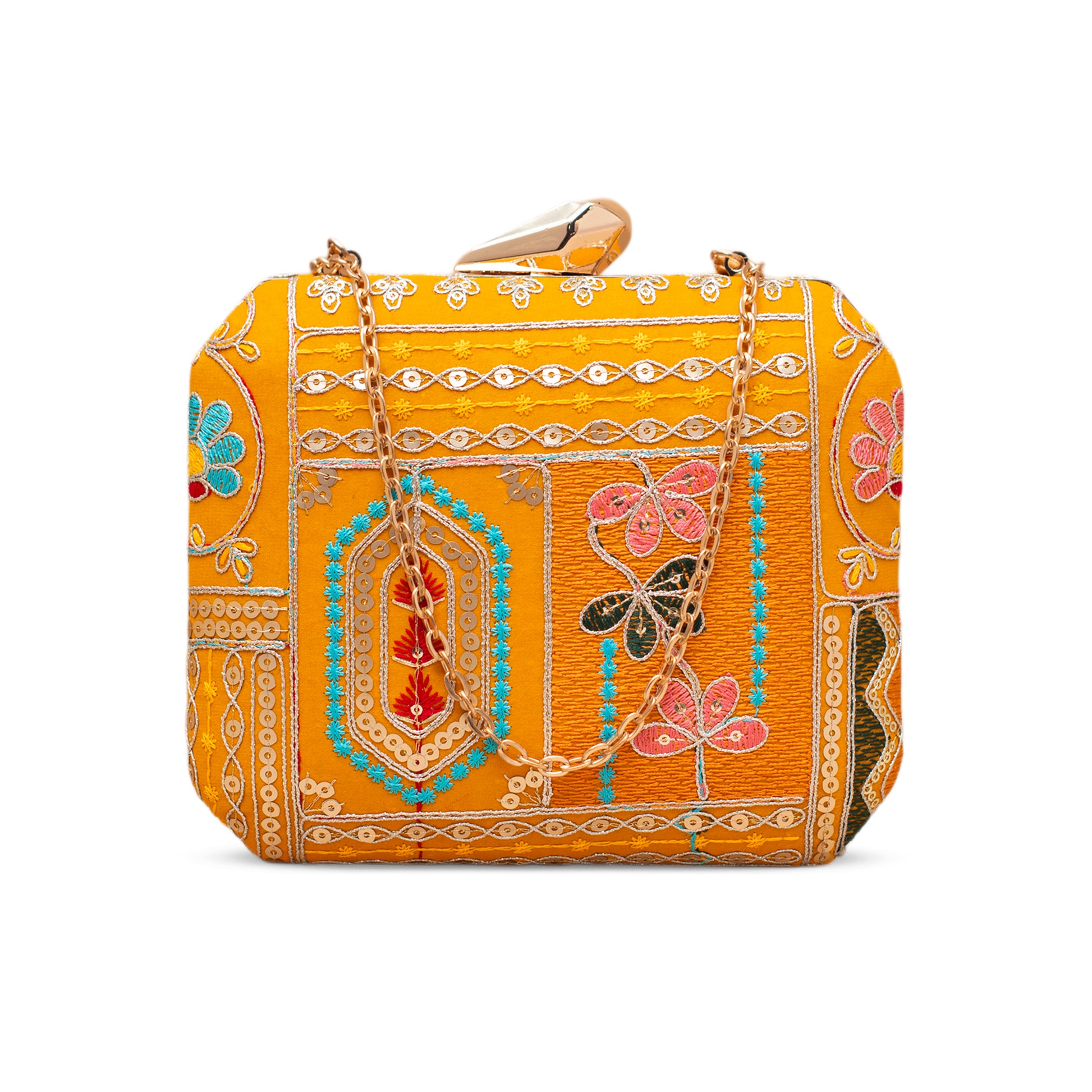Add a burst of personality to every outing with these handcrafted clutches. Designed to blend fashion and art, each piece is a mini canvas—Embroided finished with a luxe hard-case body, and accented with a gleaming gold clasp and chain.