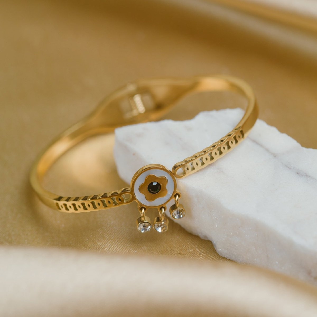 This finely crafted bracelet features a sleek gold-plated bangle adorned with delicate, intricately designed charms that exude timeless charm.