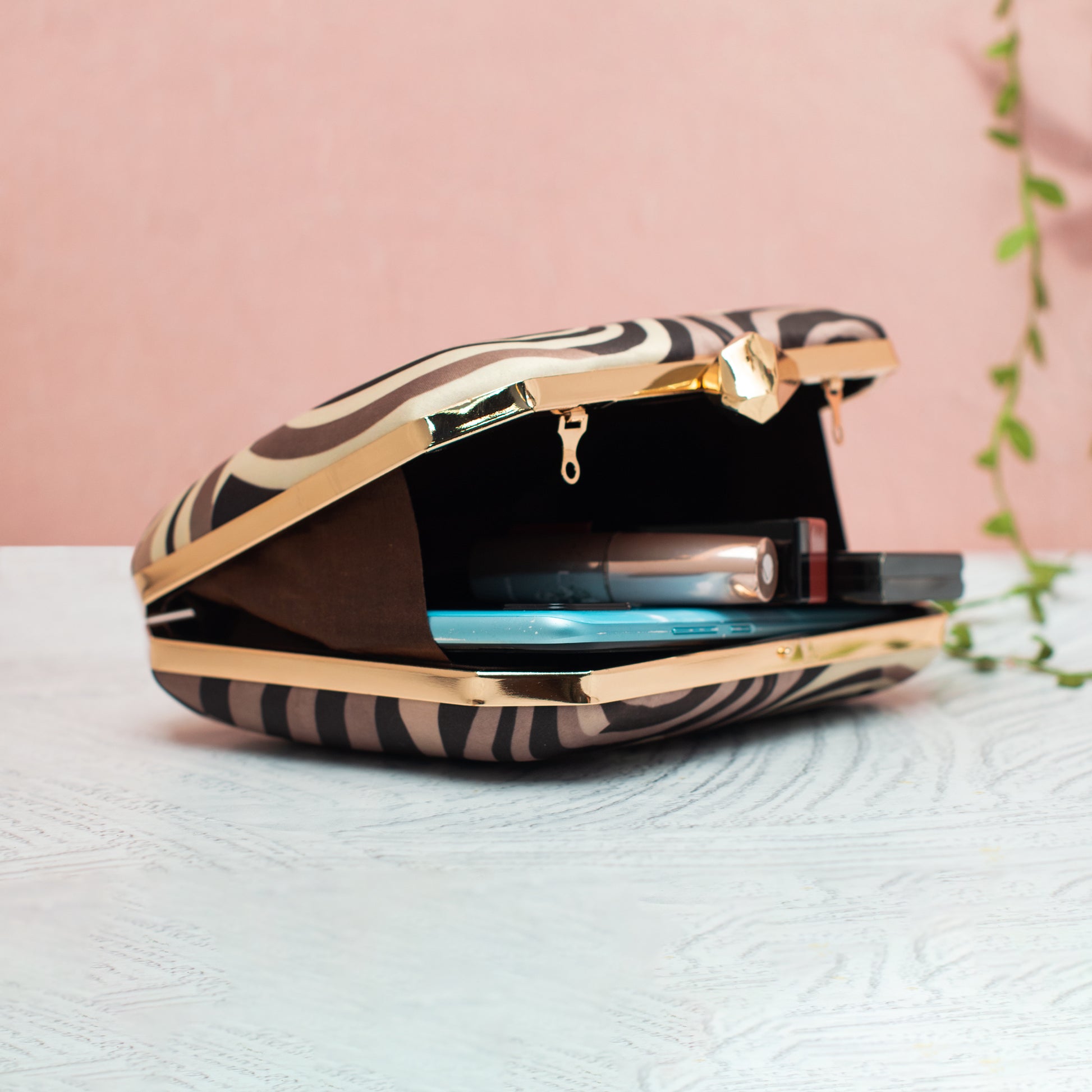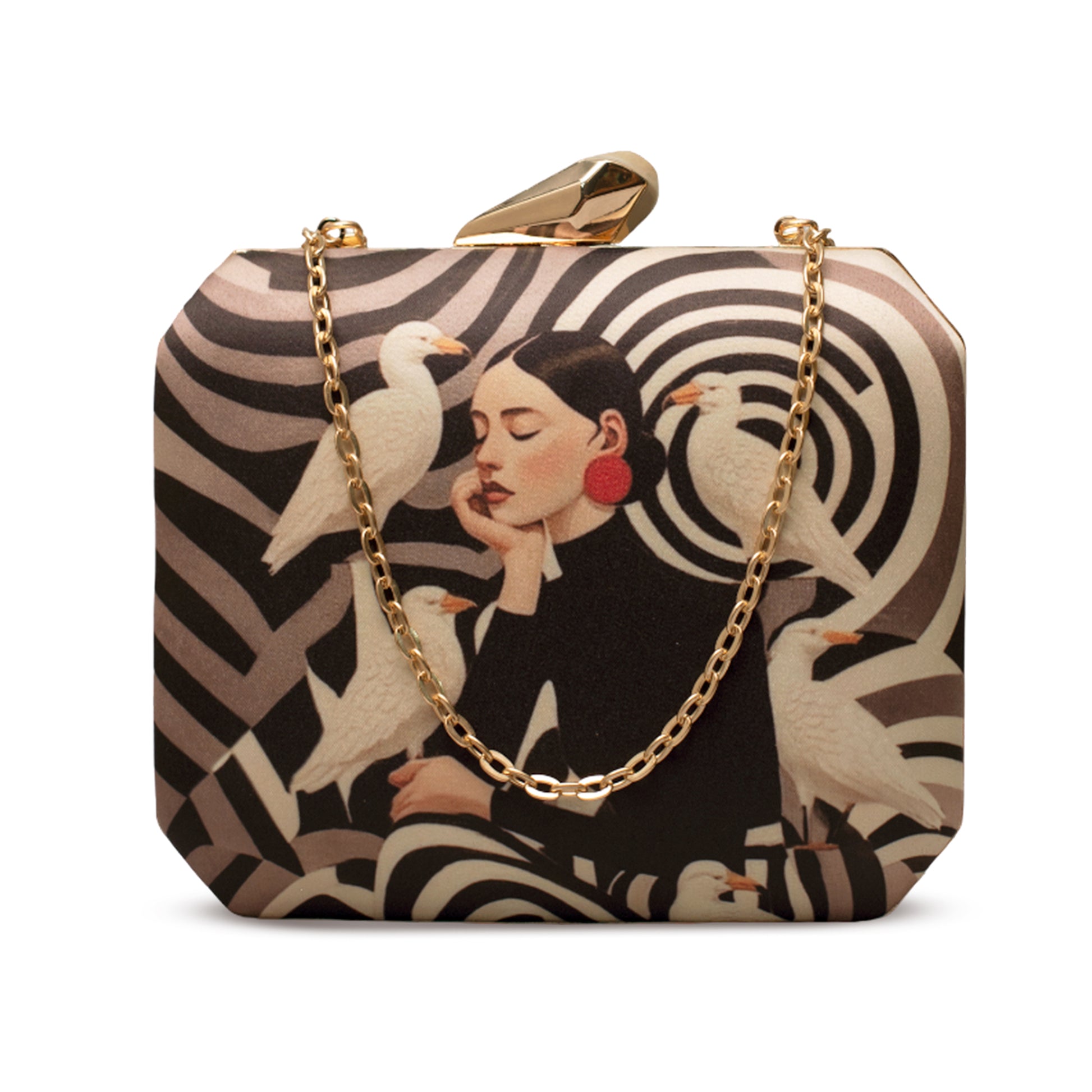 Add a burst of personality to every outing with these handcrafted clutches. Designed to blend fashion and art, each piece is a mini canvas—printed with vibrant illustrations, finished with a luxe hard-case body, and accented with a gleaming gold clasp and chain.