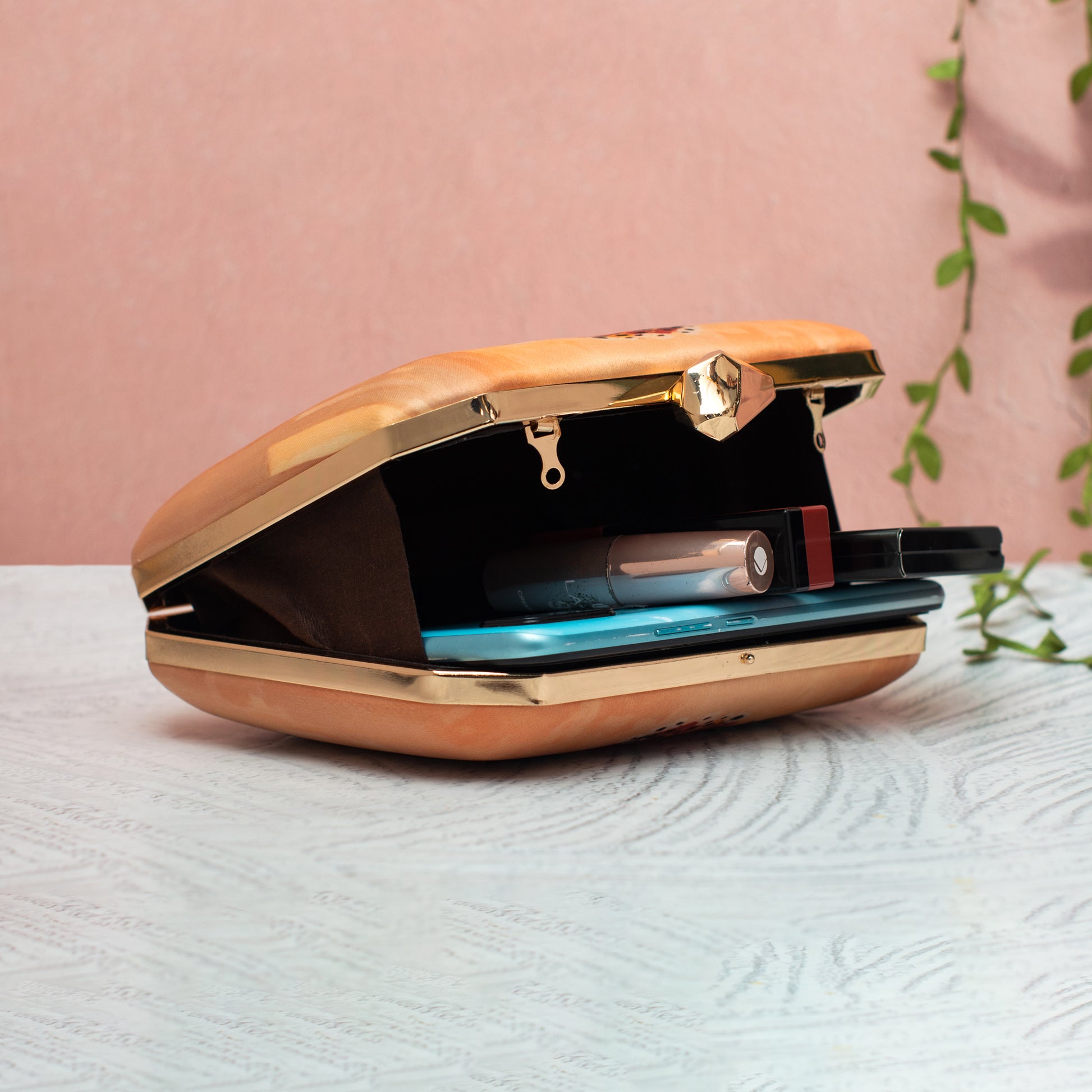 Add a burst of personality to every outing with these handcrafted clutches. Designed to blend fashion and art, each piece is a mini canvas—printed with vibrant illustrations, finished with a luxe hard-case body, and accented with a gleaming gold clasp and chain.
