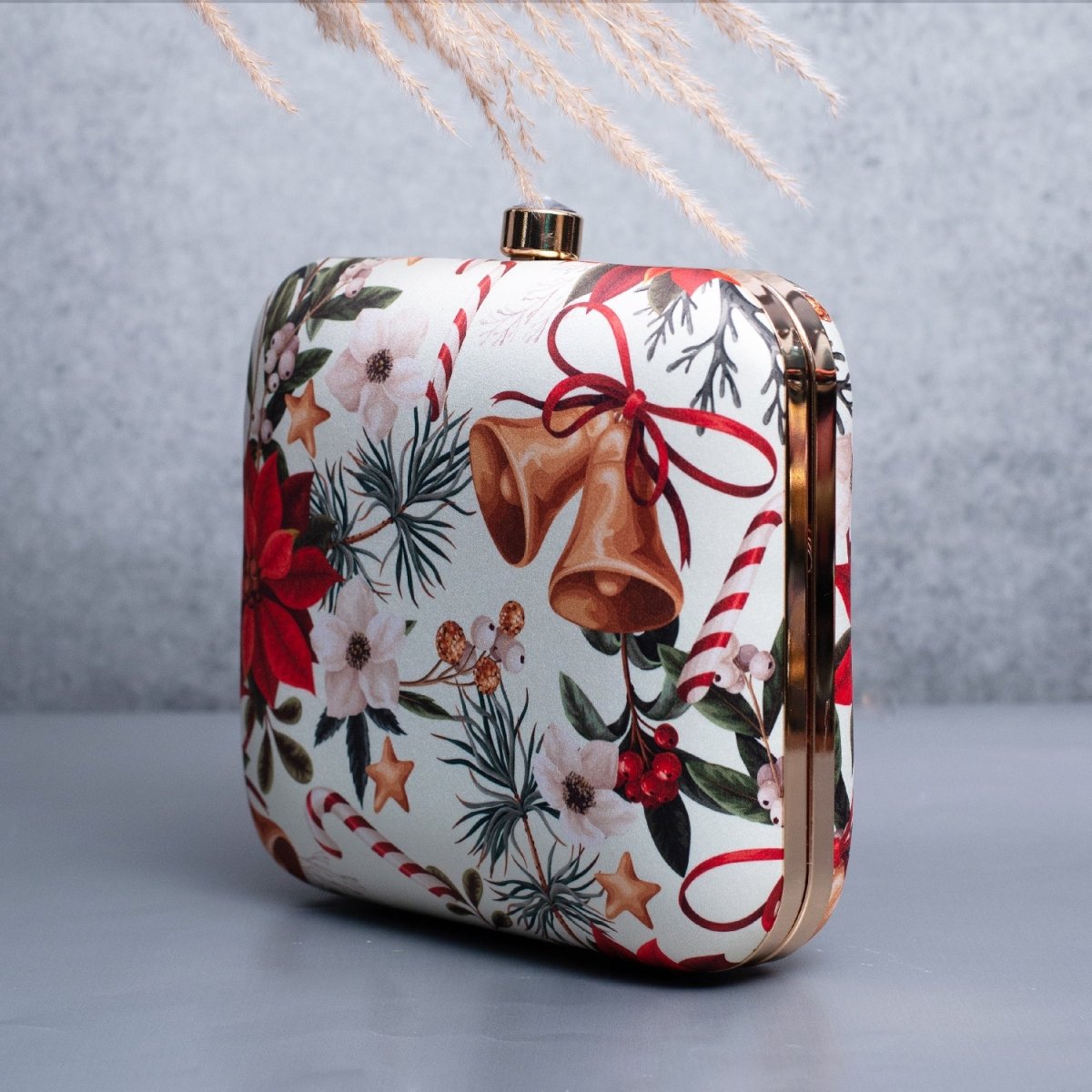 Artklim White Based Christmas Bells Printed Clutch