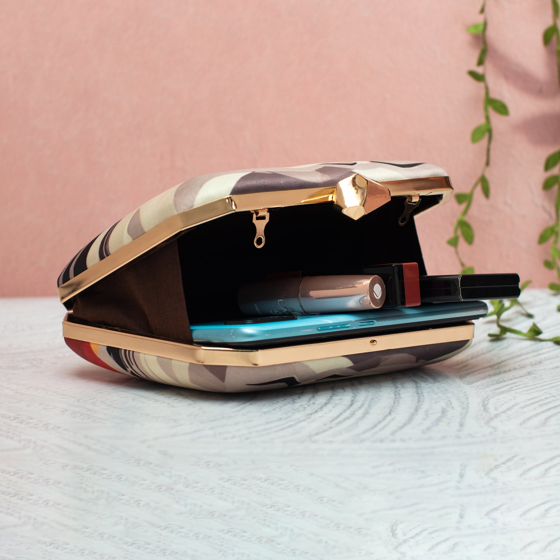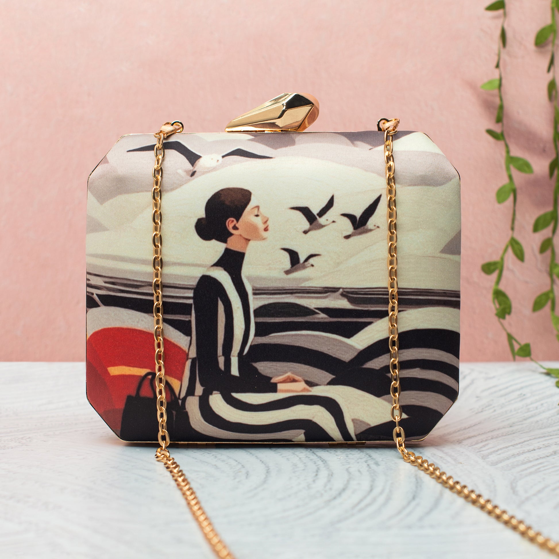 Add a burst of personality to every outing with these handcrafted clutches. Designed to blend fashion and art, each piece is a mini canvas—printed with vibrant illustrations, finished with a luxe hard-case body, and accented with a gleaming gold clasp and chain.