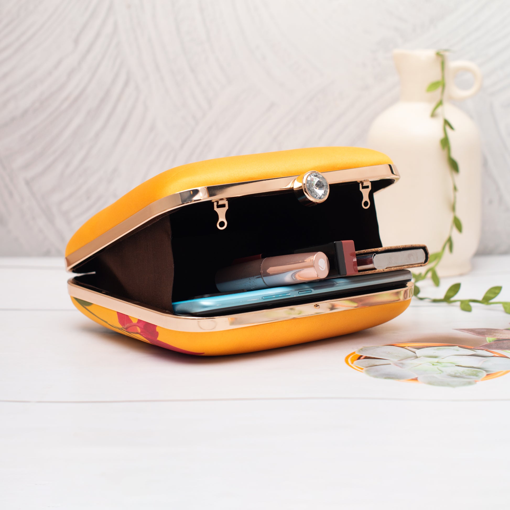Add a burst of personality to every outing with these handcrafted clutches. Designed to blend fashion and art, each piece is a mini canvas—printed with vibrant illustrations, finished with a luxe hard-case body, and accented with a gleaming gold clasp and chain