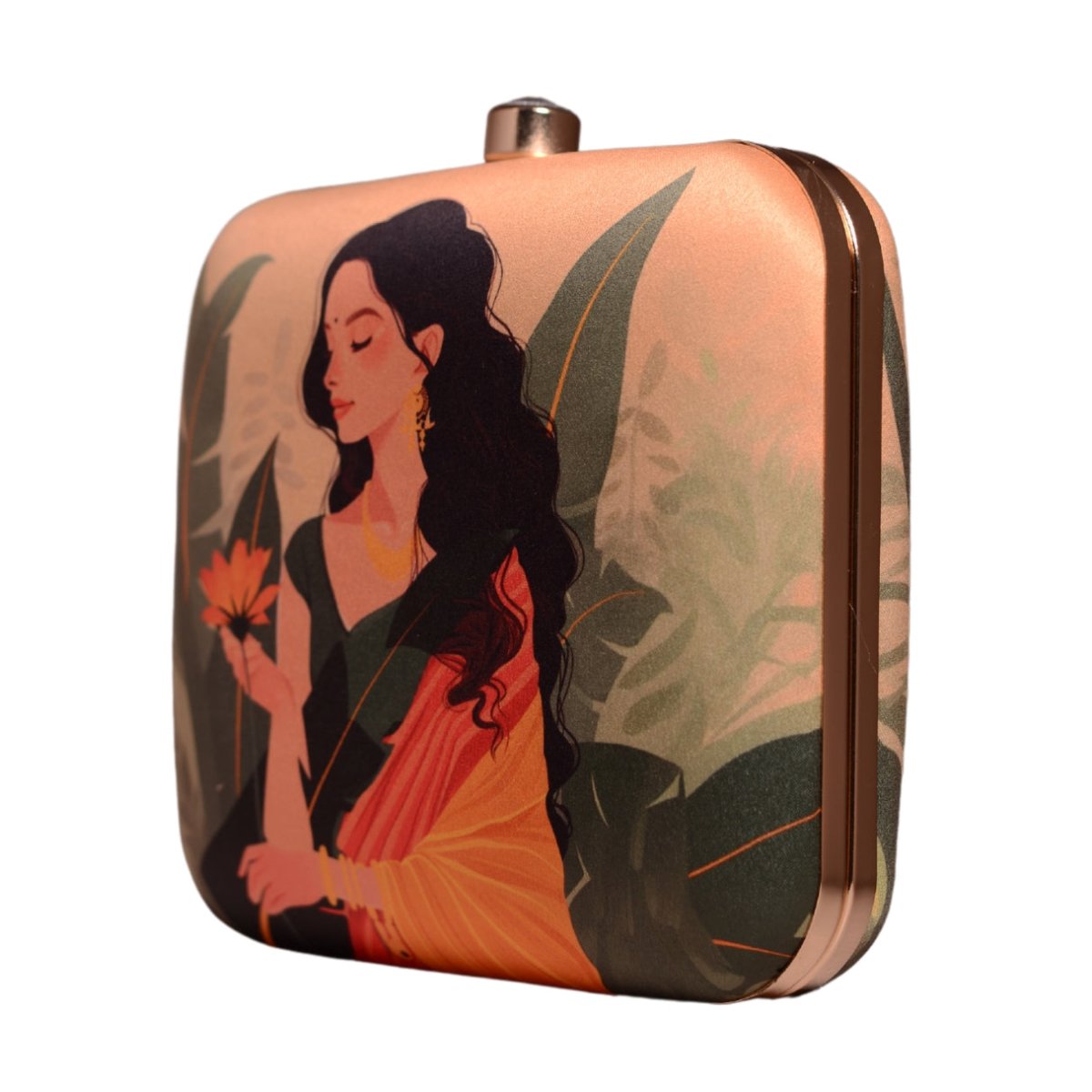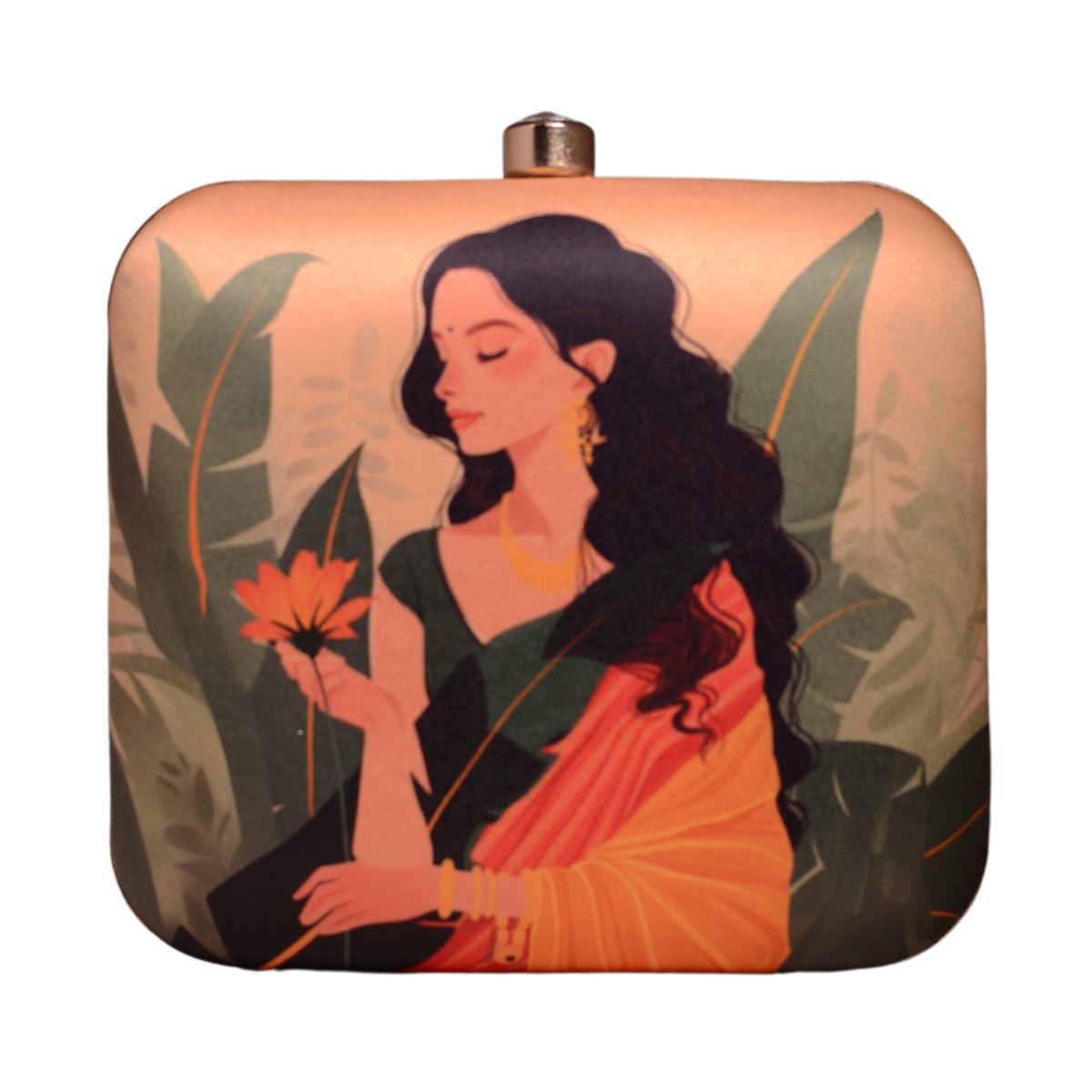 Beige Based Indian Woman In Yellow Saree Printed Clutch