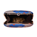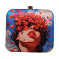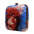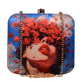 Blue Based Floral Girl With Bold Red Lips Printed Clutch