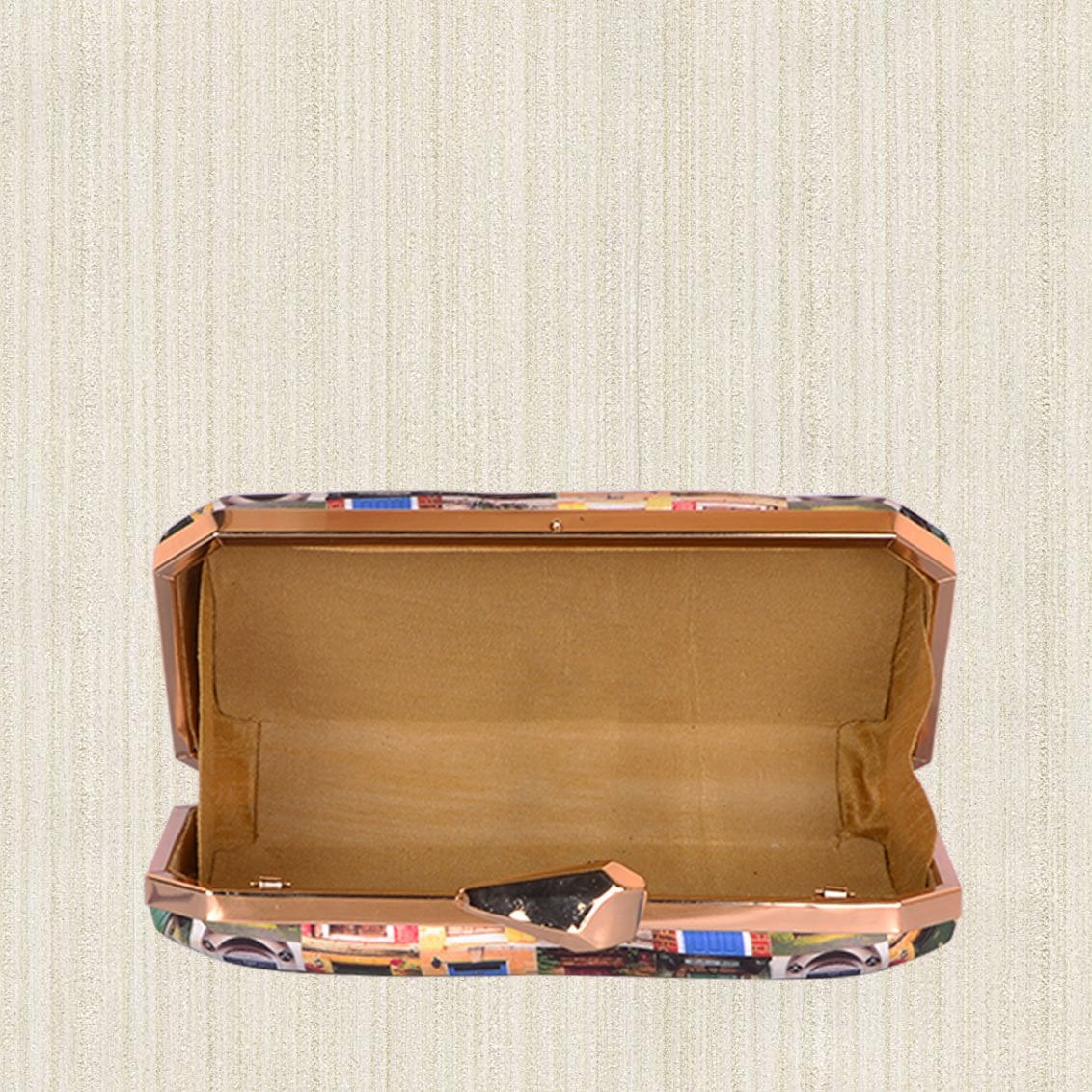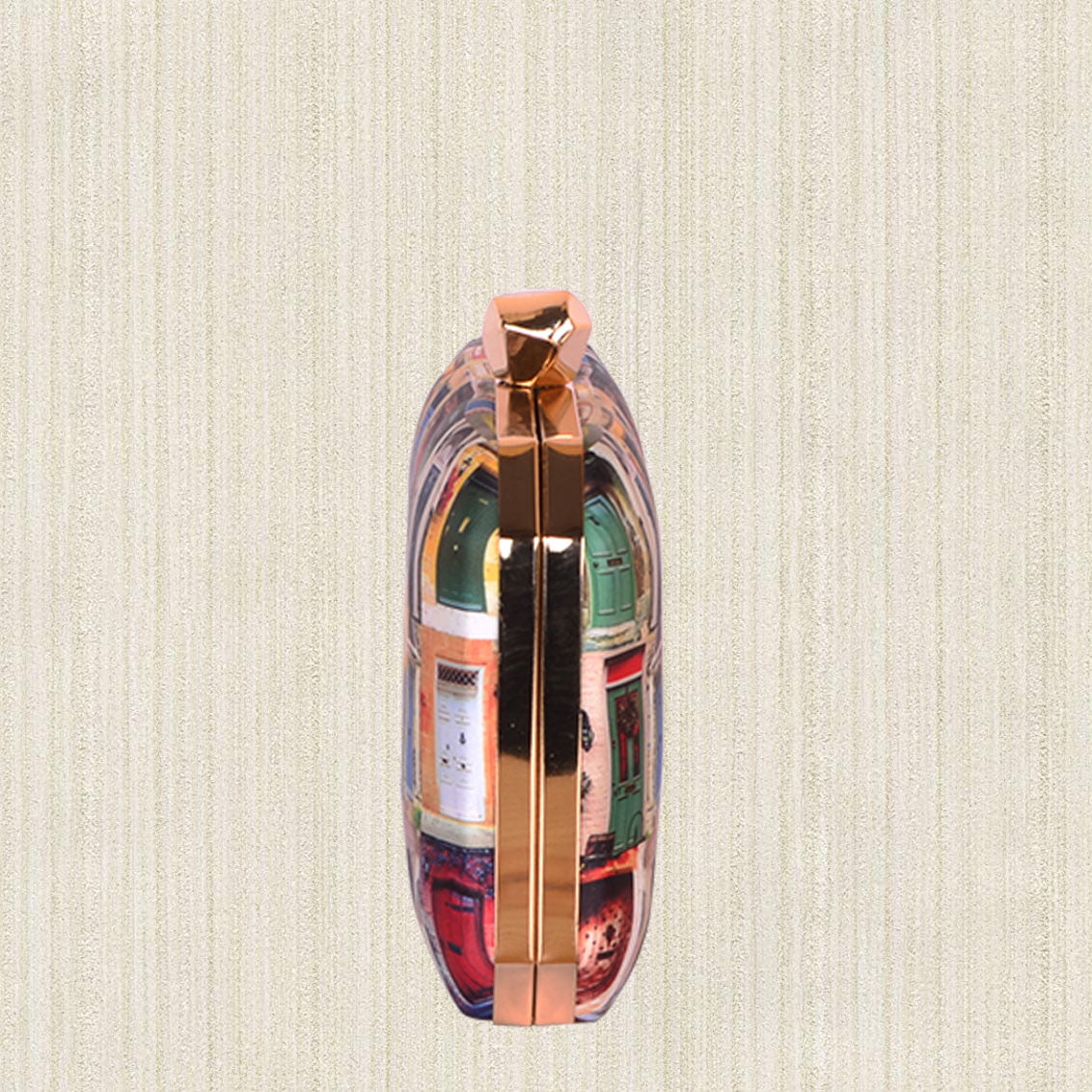 This cool rectangular clutch has colourful doors printed on it, with a gold chain that you can use to deck up your apparel for the day. It is bright and colourful to make your day more beautiful.
