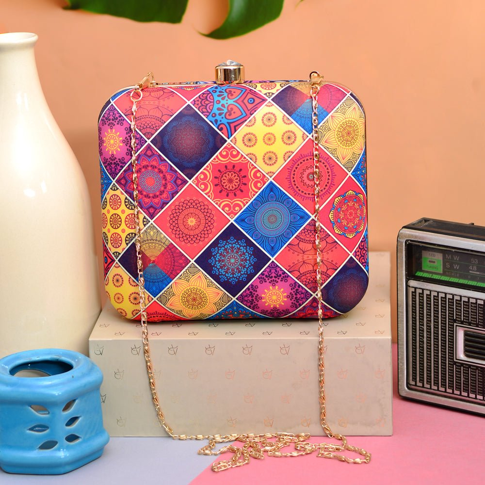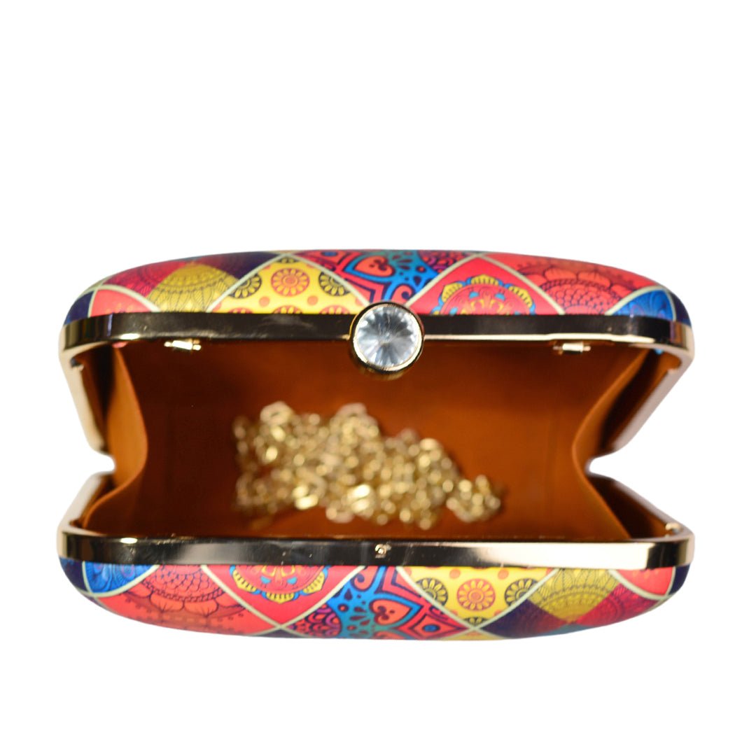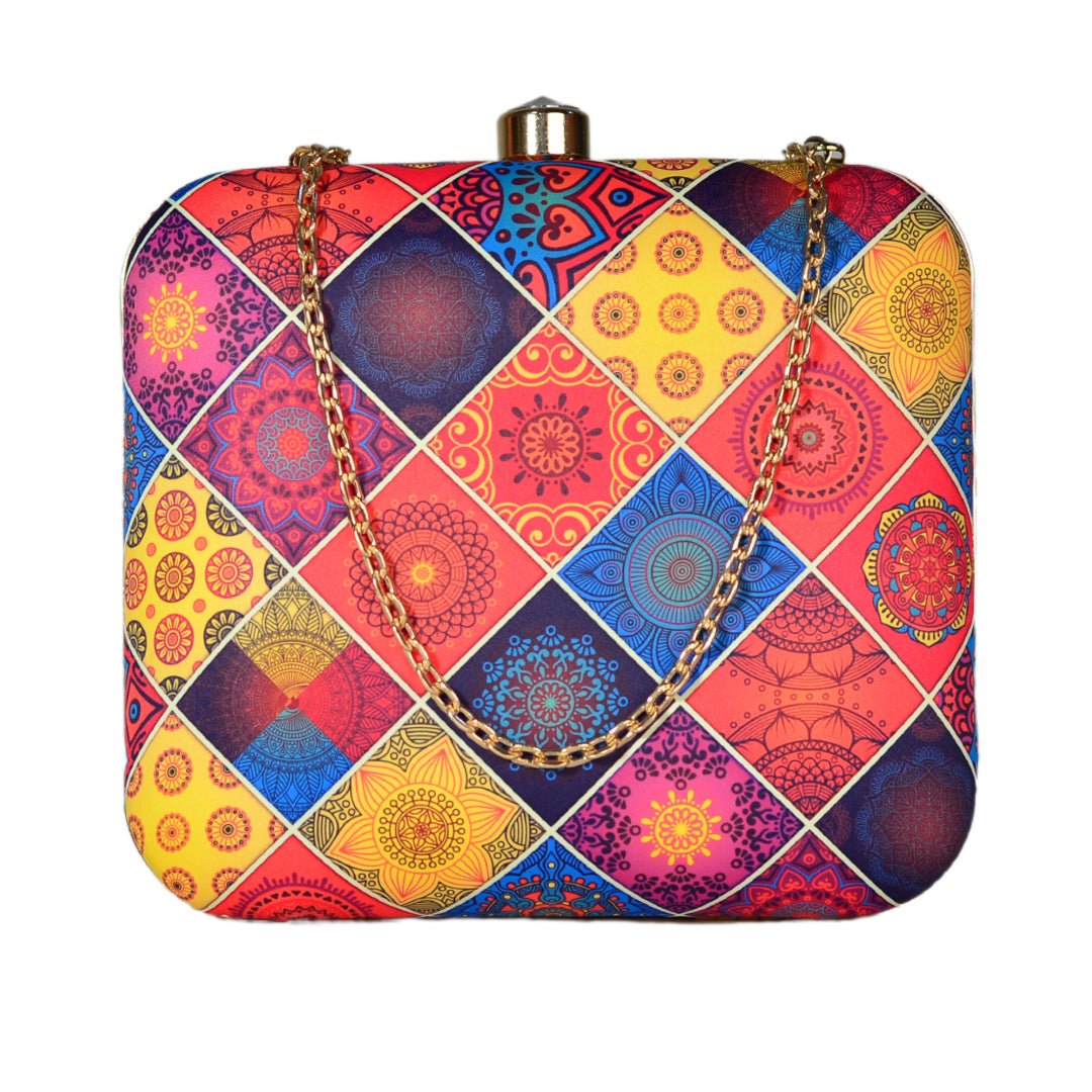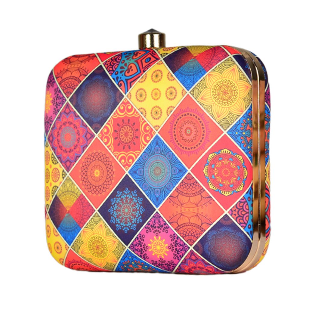 Diamond Shaped Multi-Coloured Printed Pattern Clutch.
