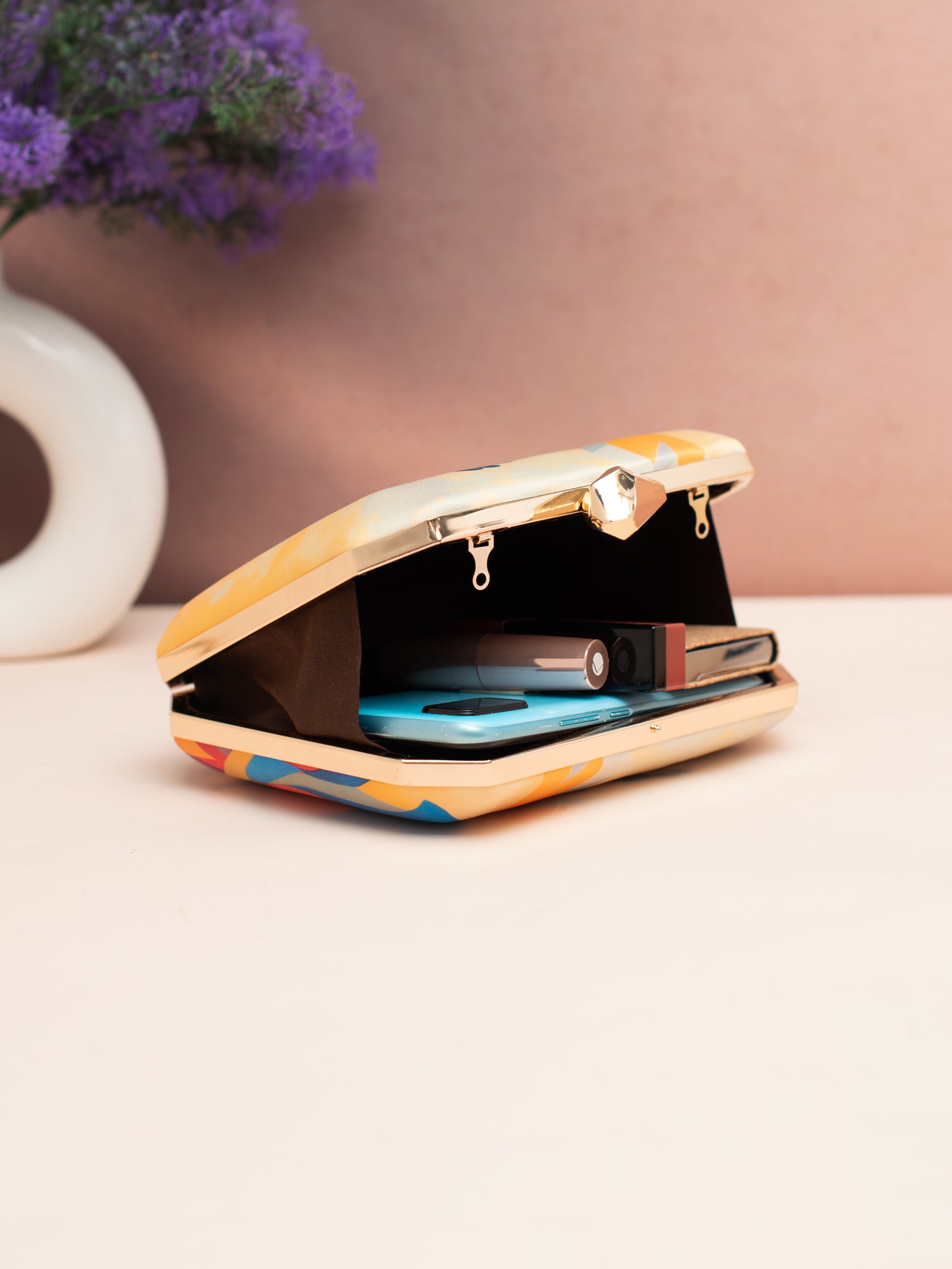 Add a burst of personality to every outing with these handcrafted clutches. Designed to blend fashion and art, each piece is a mini canvas—printed with vibrant illustrations, finished with a luxe hard-case body, and accented with a gleaming gold clasp and chain.