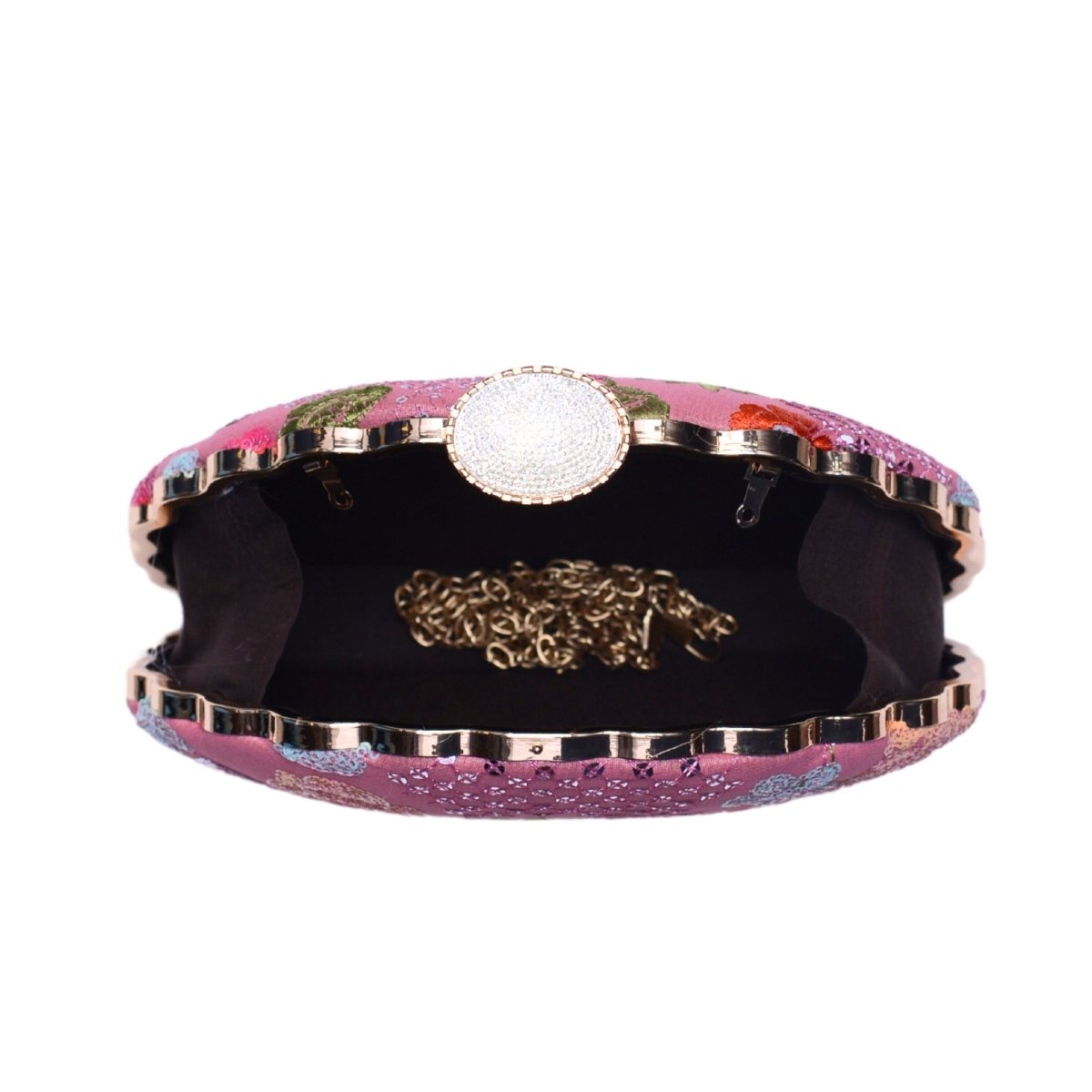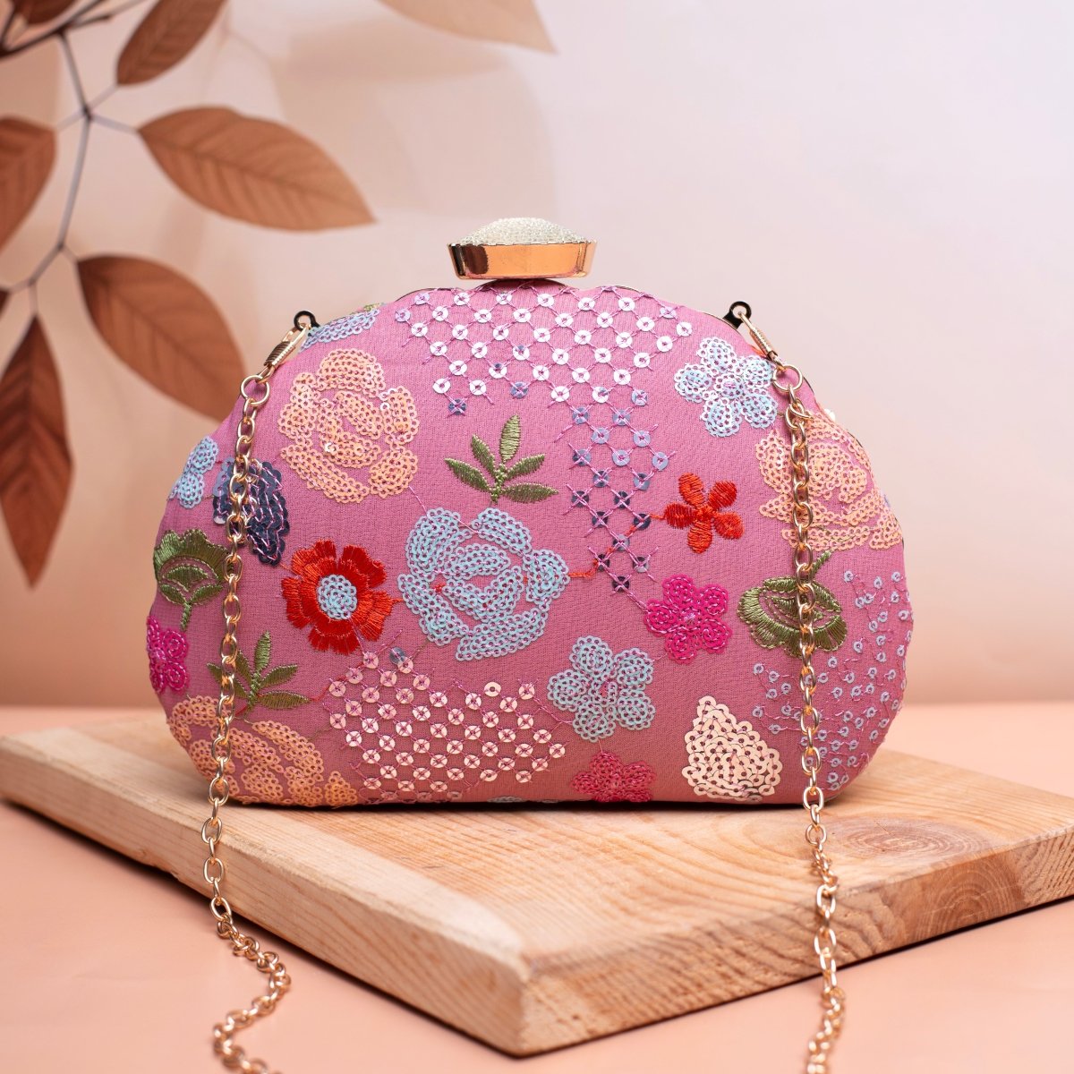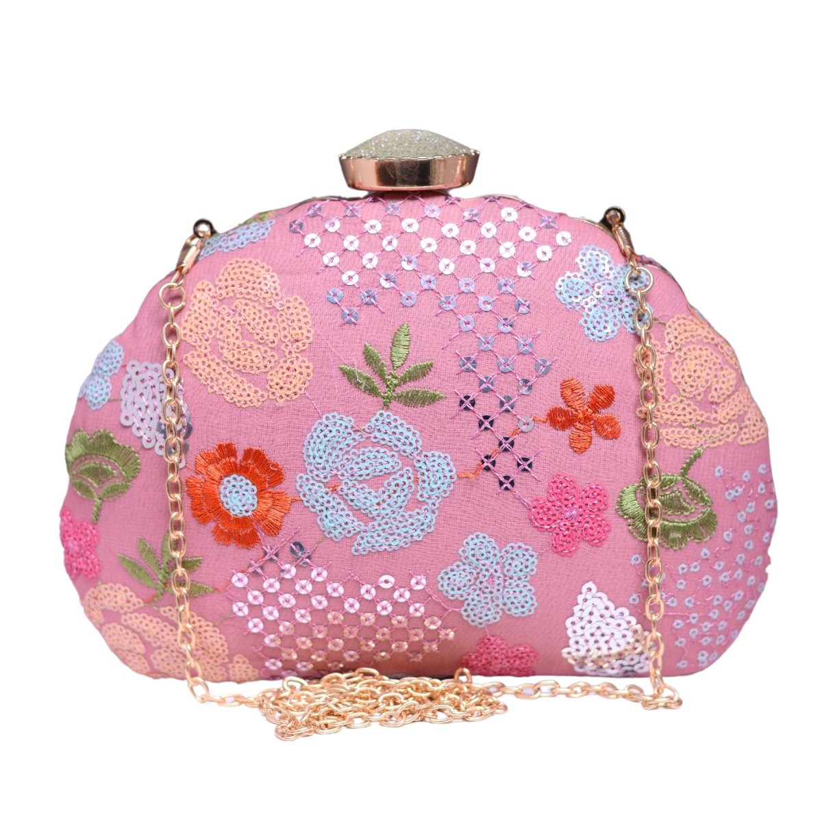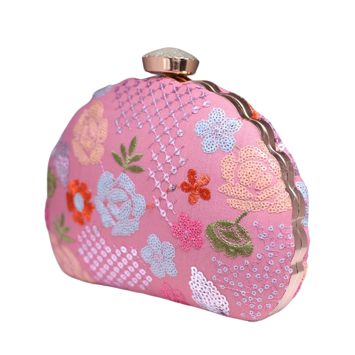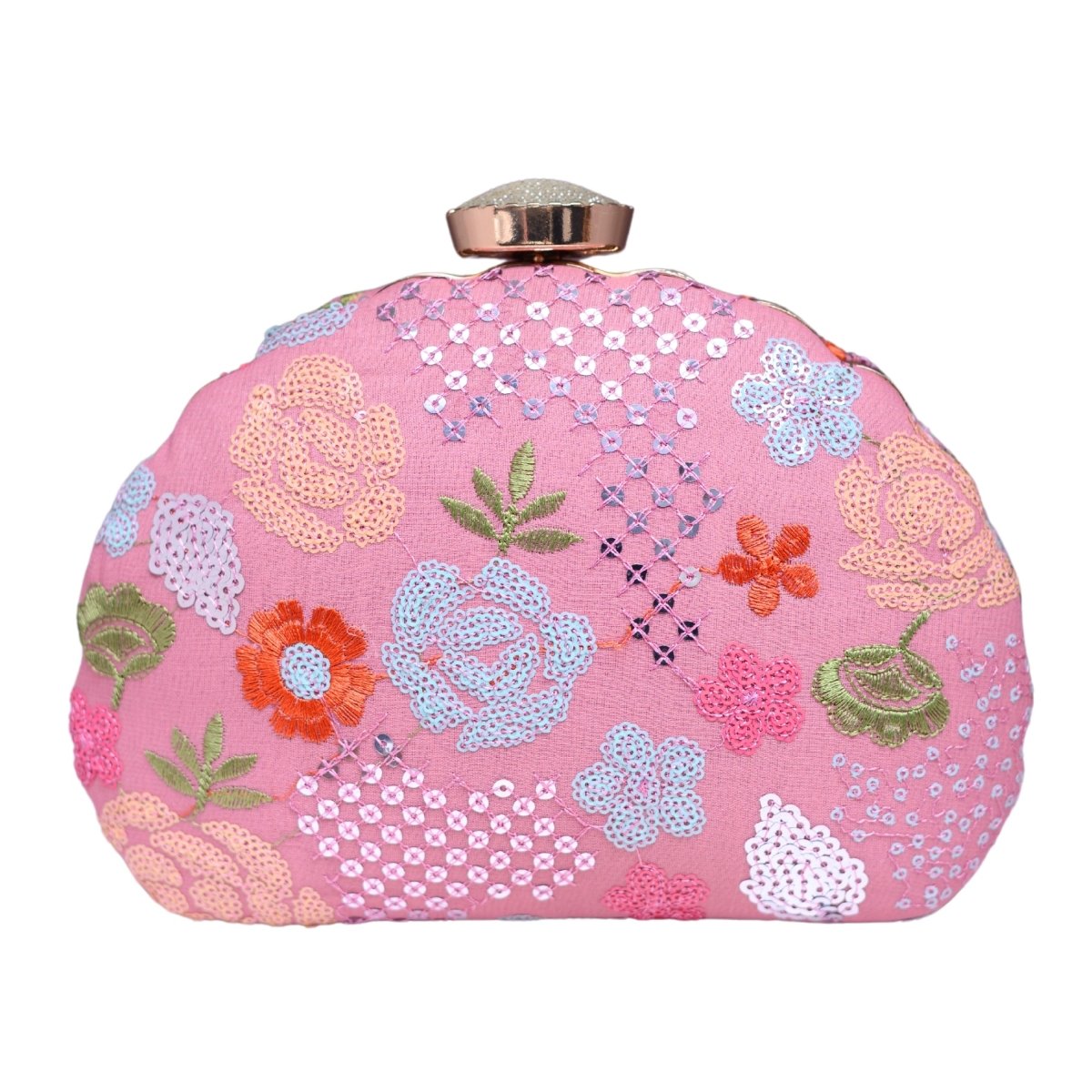 Pink Floral Sequins Embroidered Fabric Clutch