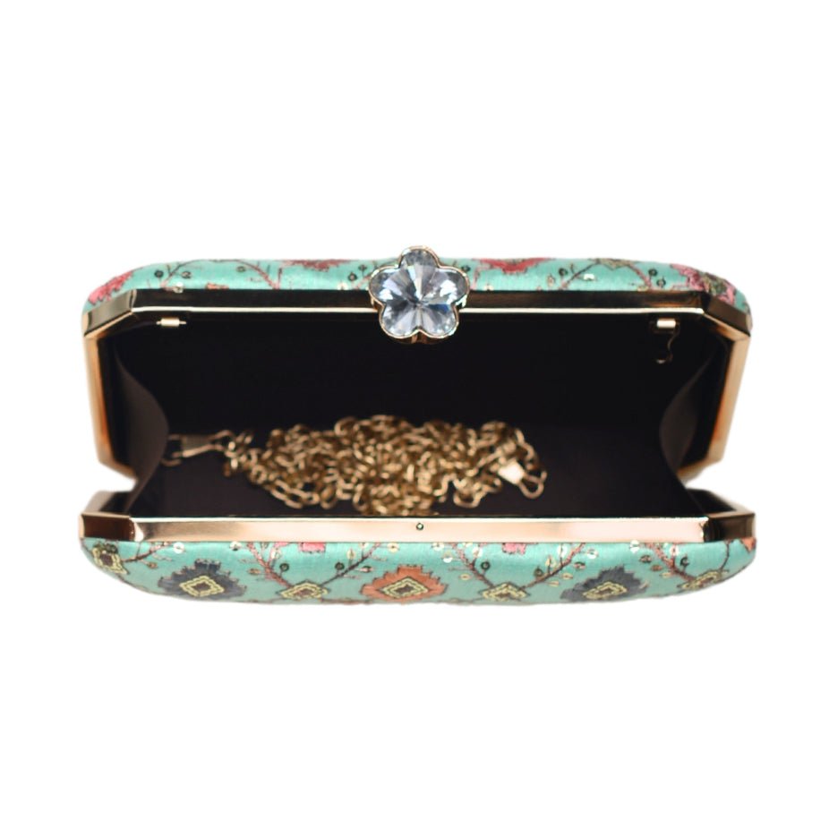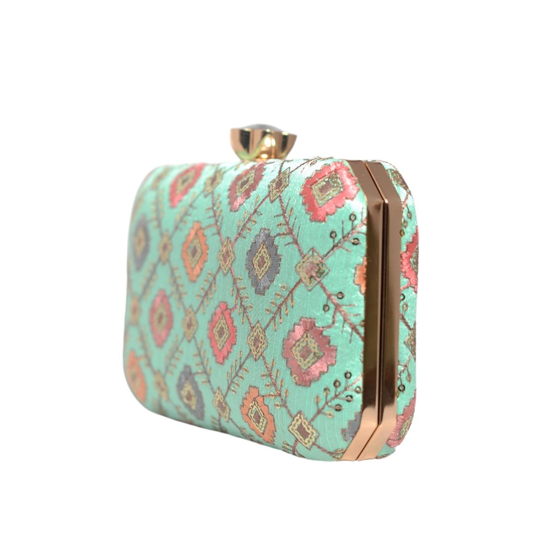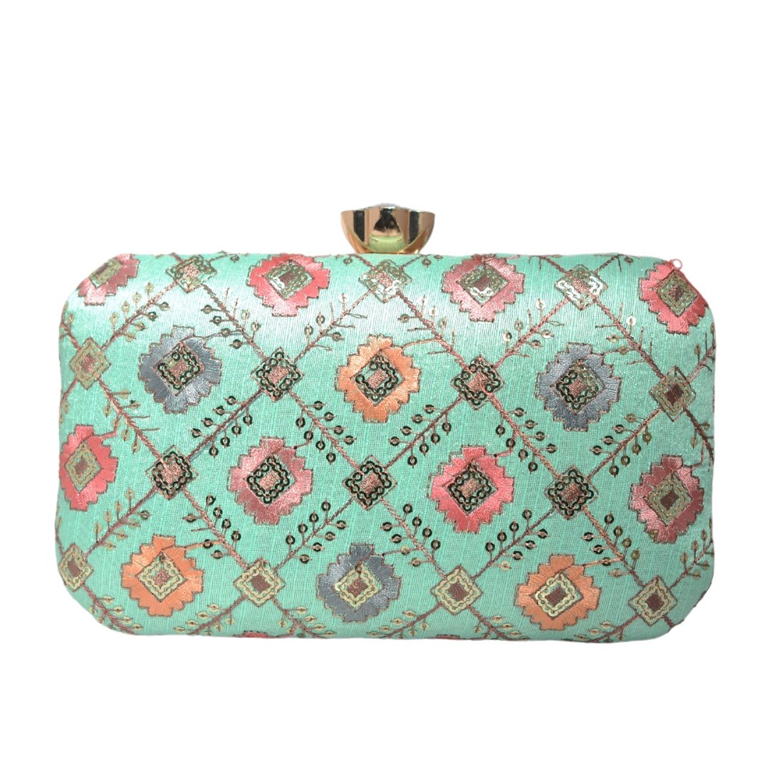 Torquise Sequins Rectangle Embroidery Clutch